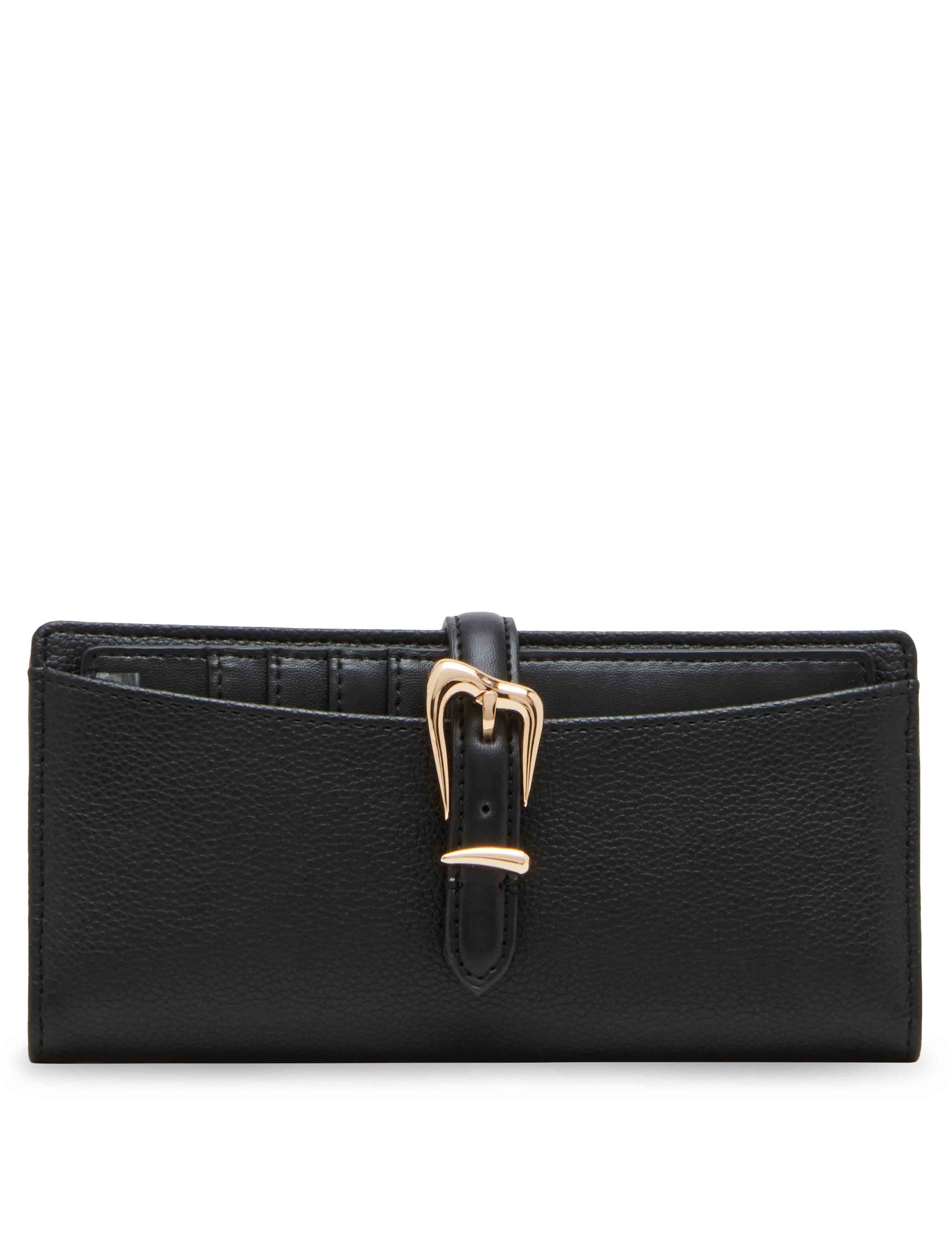 - Wallet closure uses a sculpted buckle for secure access