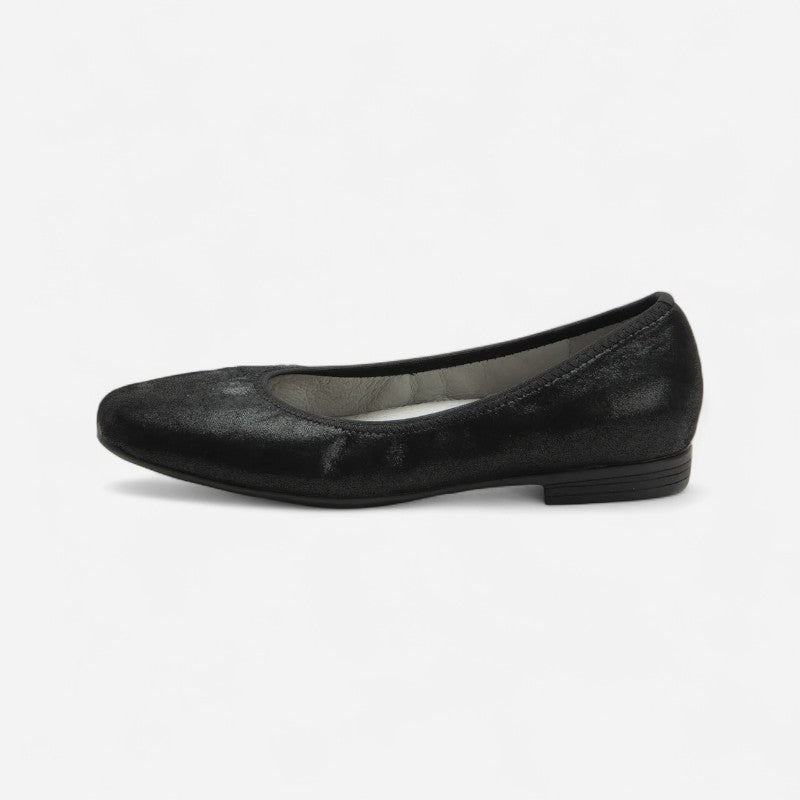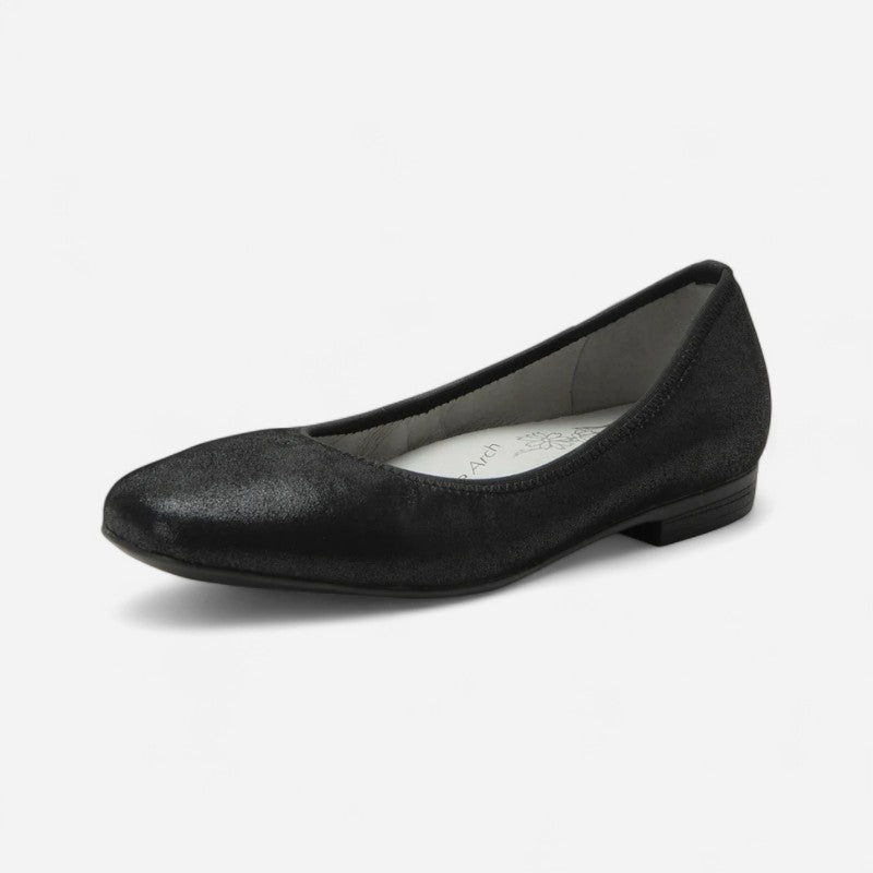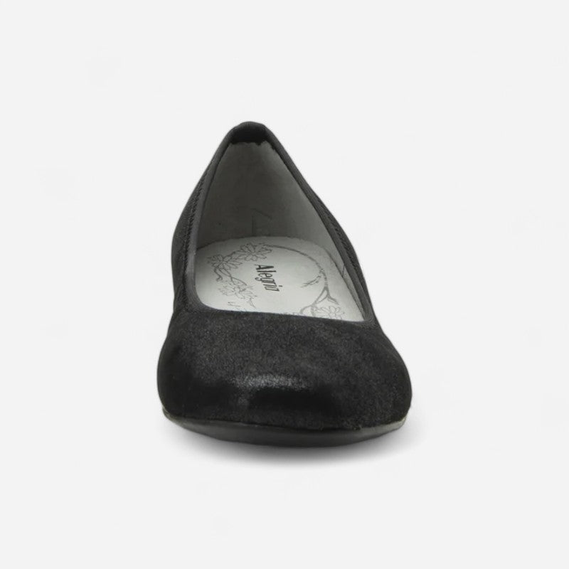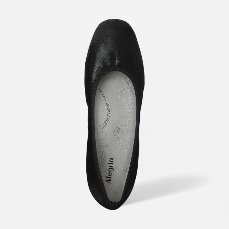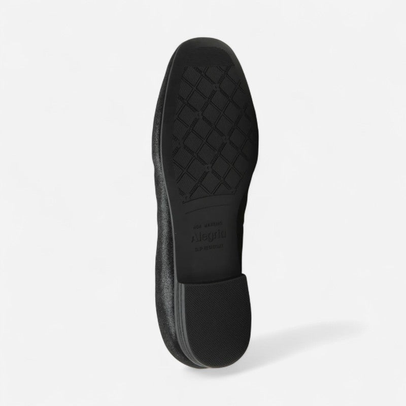 Make a bold impression with the Alegria Arielle in Striking, a rich black ballet flat with a soft metallic sheen. This timeless round toe silhouette is elevated with a subtle shimmer that catches the light, offering an elegant yet confident look.