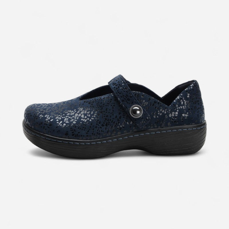 The perfect blend of style and comfort, the Opheliah shoe features a stain-resistant, soft leather upper with an adjustable hook-and-loop strap and a padded inside collar. This style also provides the comfort we are known for with a durable microsuede removable footbed, ergonomically designed to conform to the contours of your feet, offering robust all-day arch support.