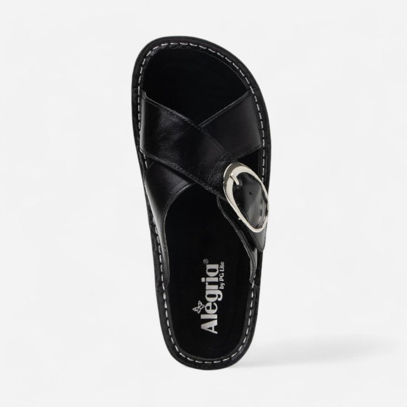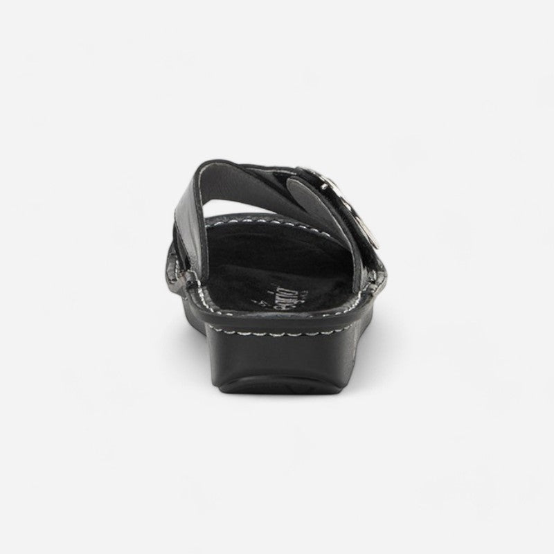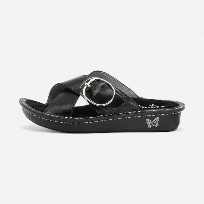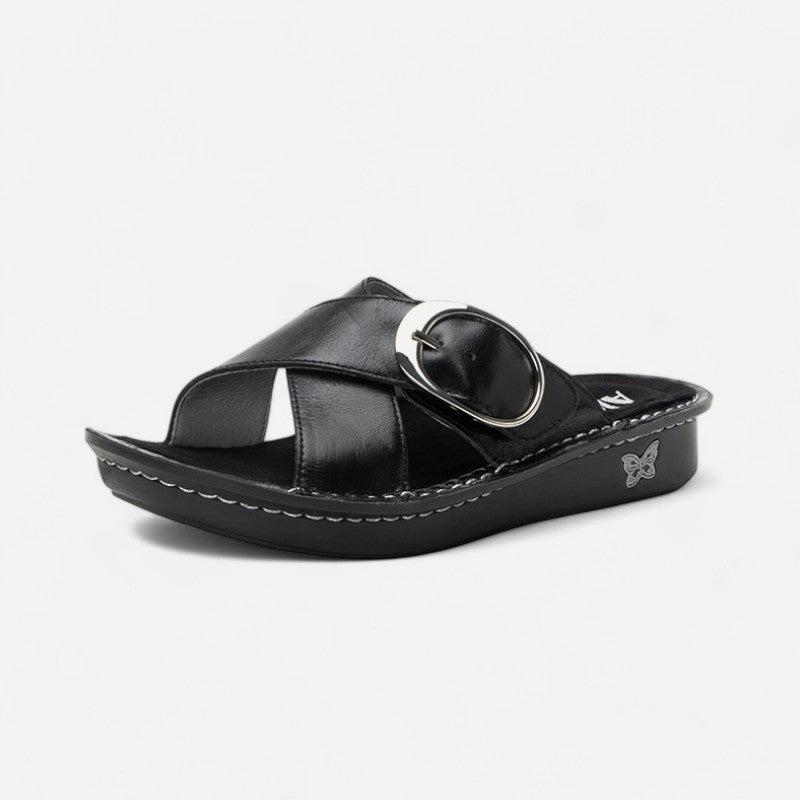 The classic crisscross sandal takes a bold step forward in this handstitched version with an ornamental buckle set on an adjustable hook-and-loop strap. A removable contoured footbed made of cork and memory foam, seamlessly fit into a mini outsole for walking ease. For added versatility, choose from uppers in textured calf hair or smooth leather.