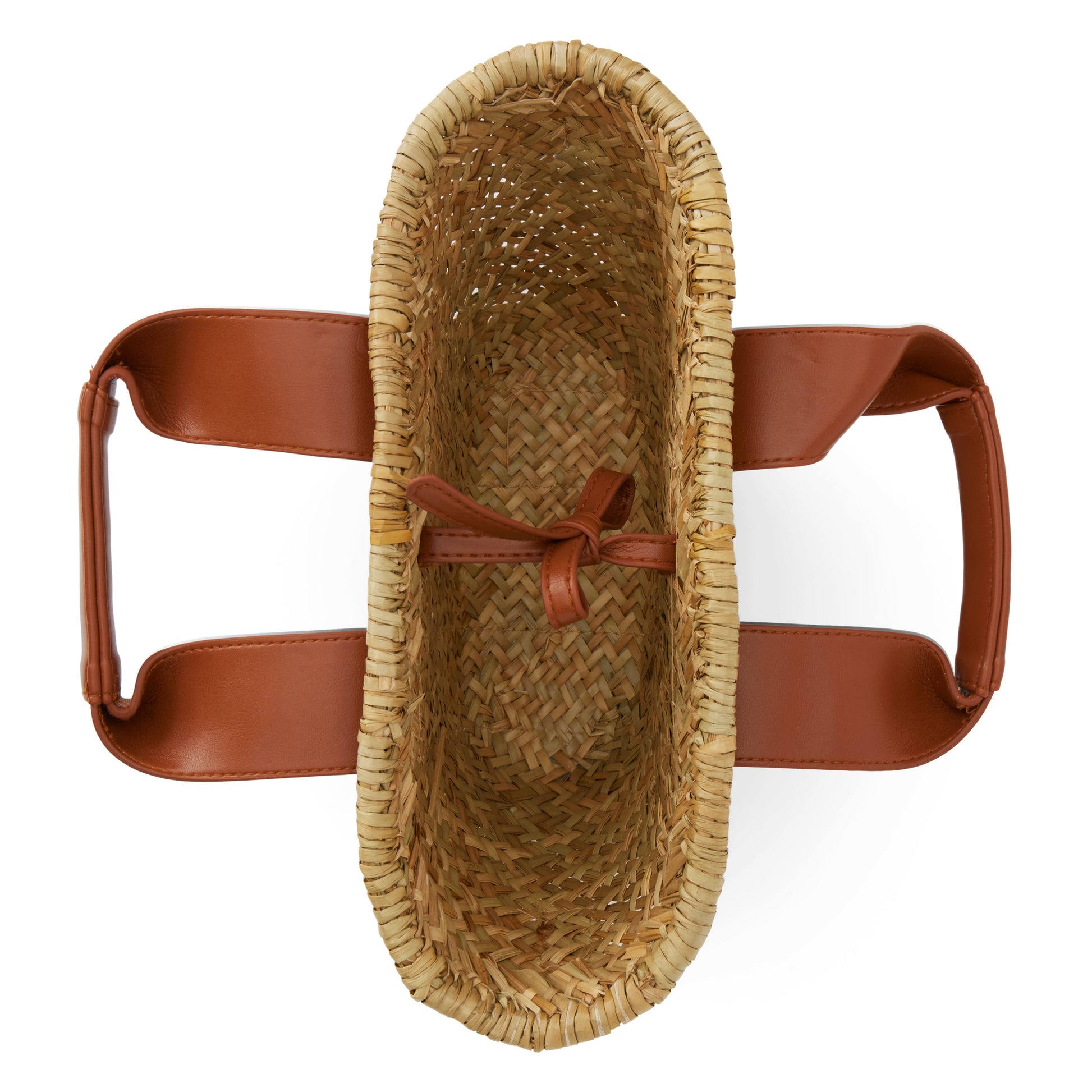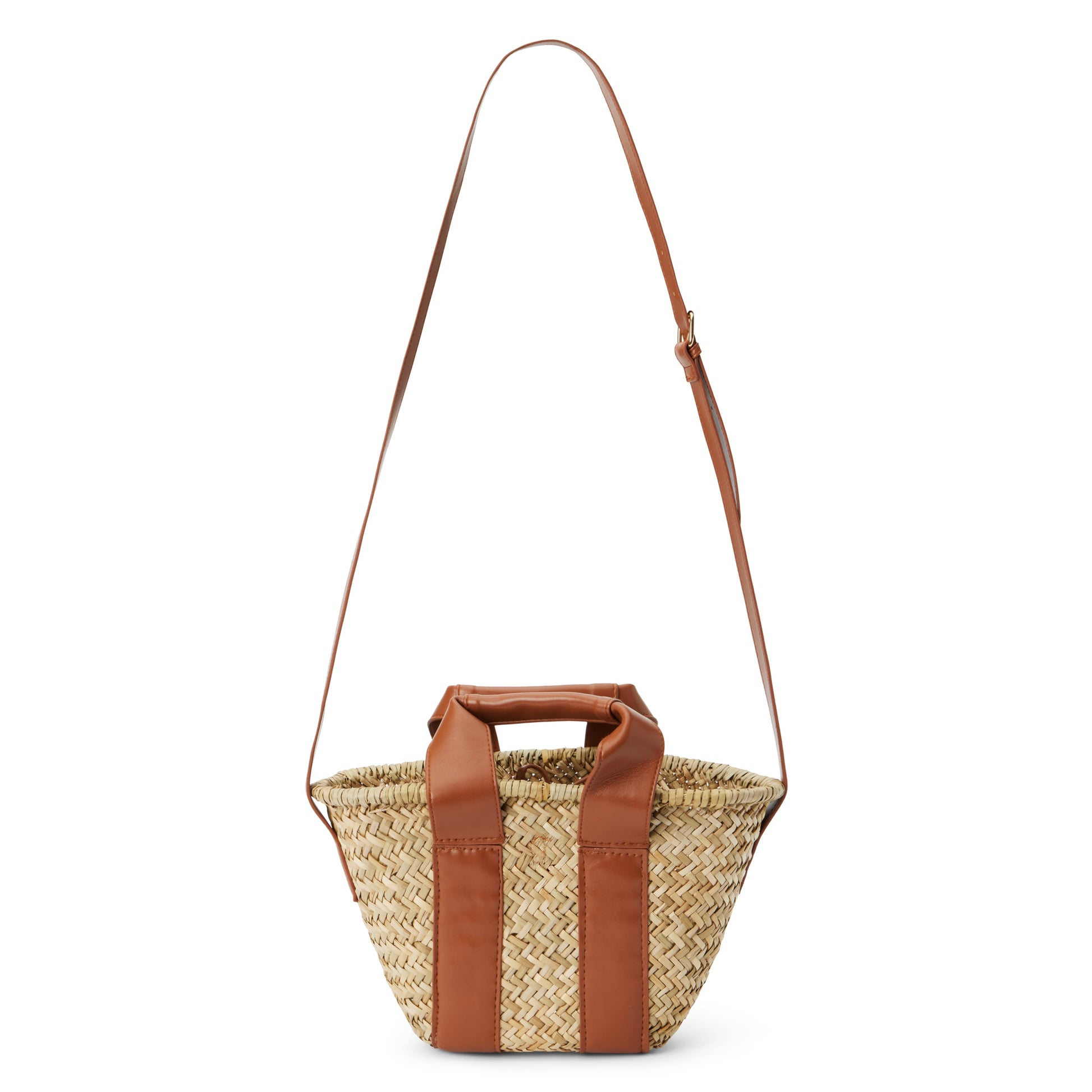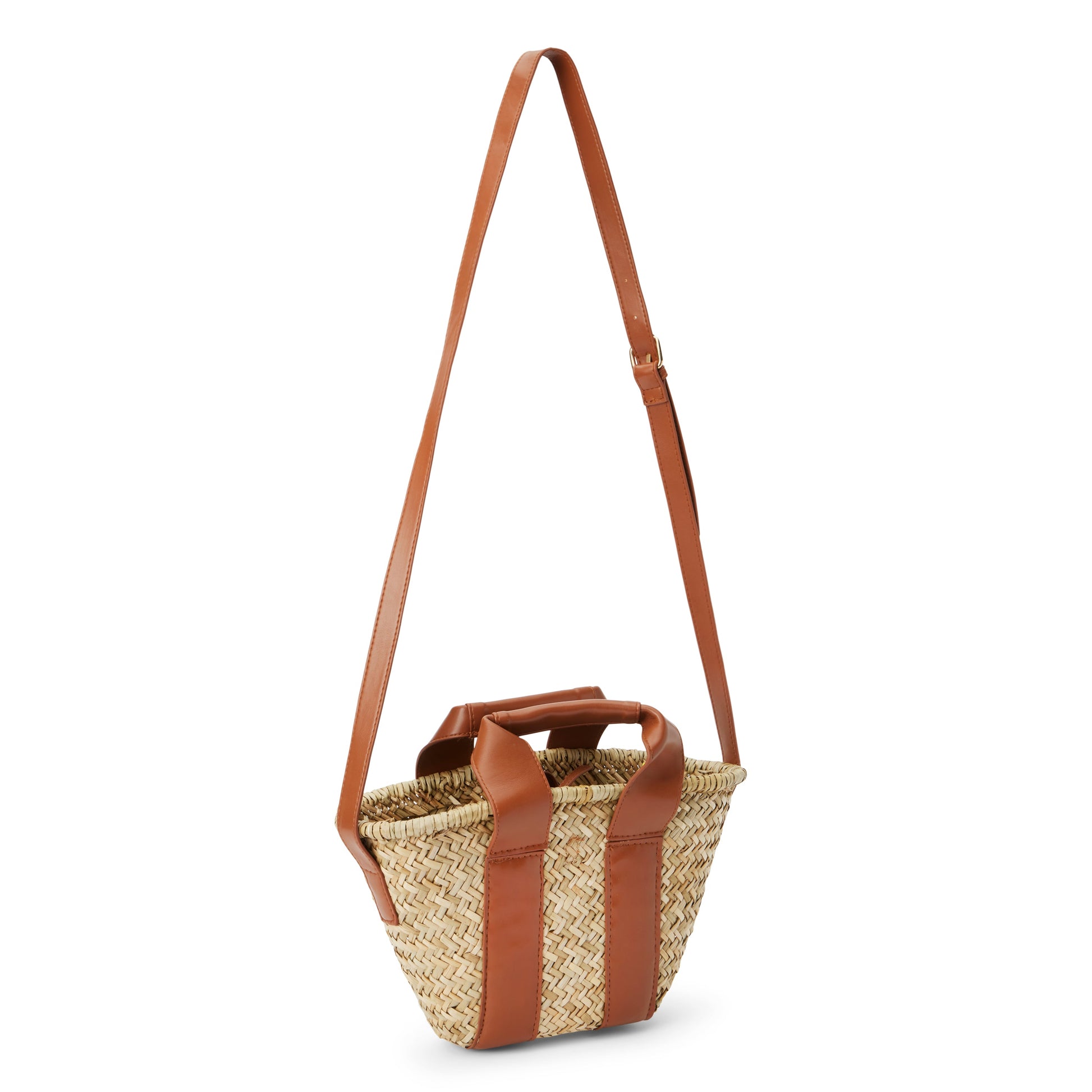 A raffia-woven bag featuring vegan leather top straps and an adjustable shoulder strap for versatile wear.