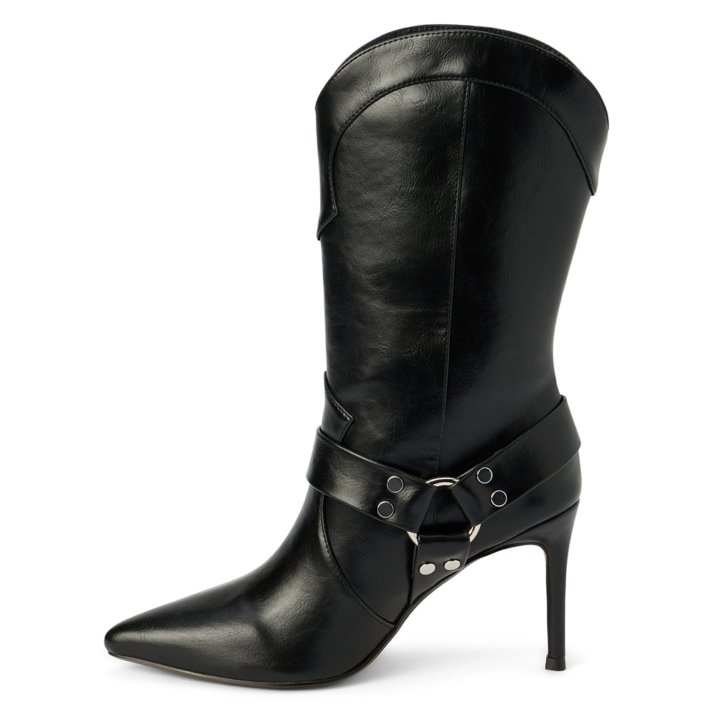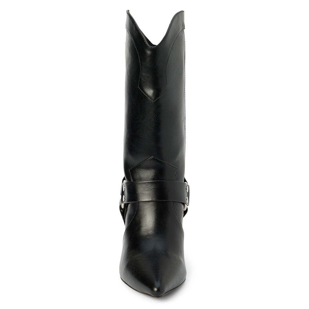 A vegan, Western-inspired stiletto boot featuring a harness detail for a bold, fashion-forward look.