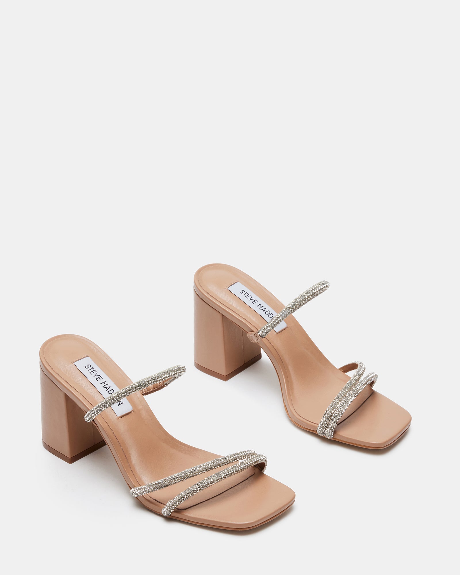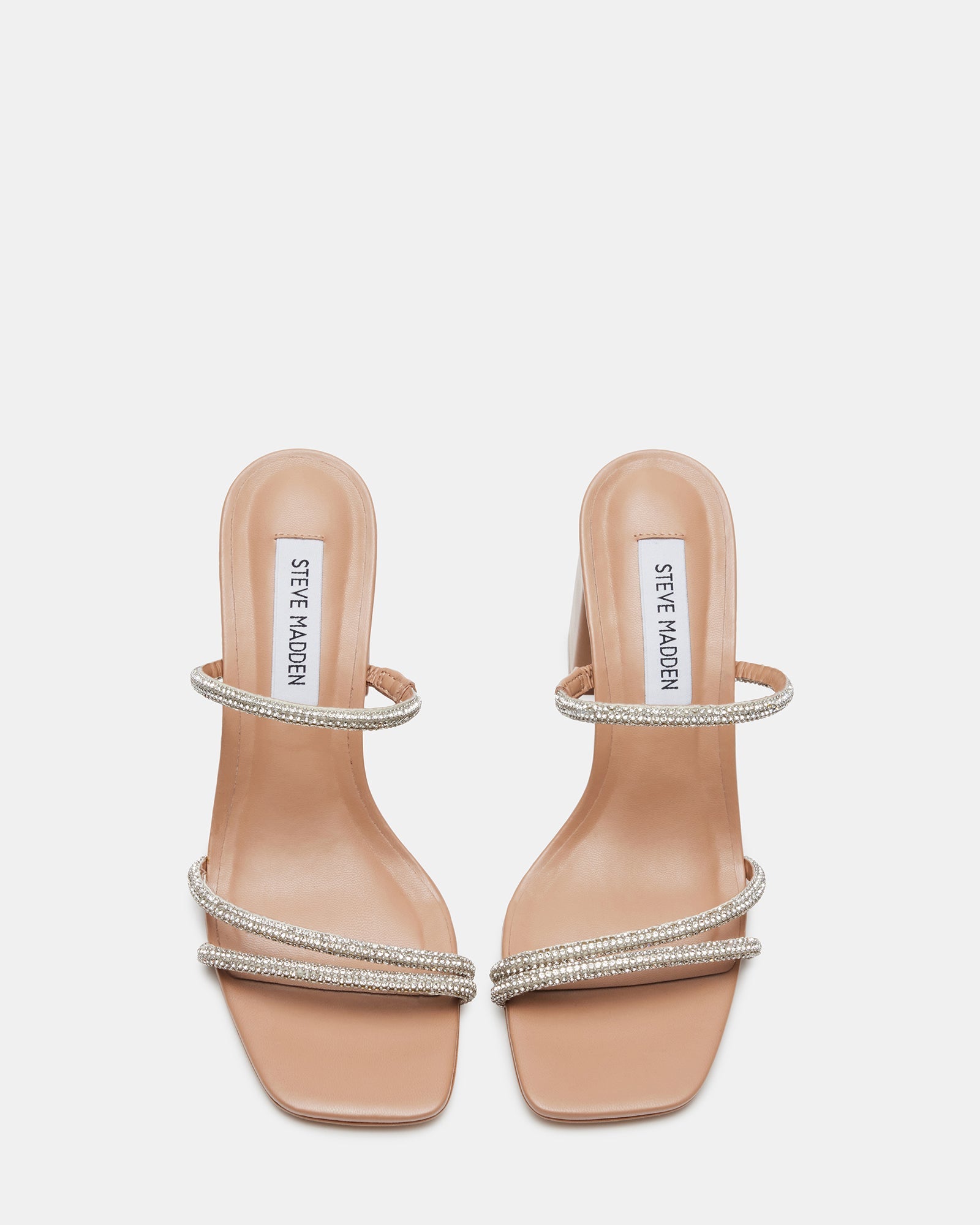 Step into a chic slide that gleams with rhinestones along the tubular straps for a touch of sparkle.