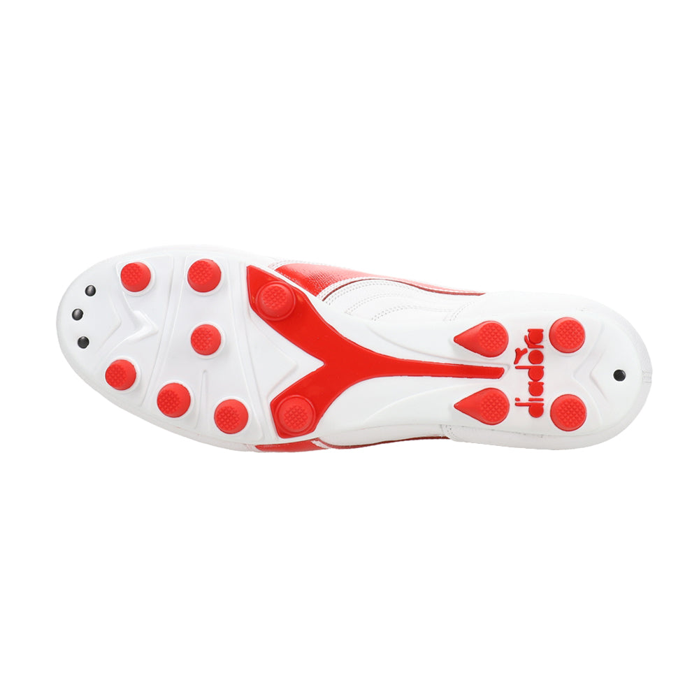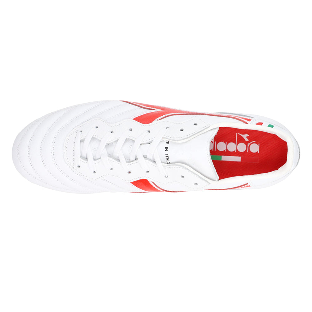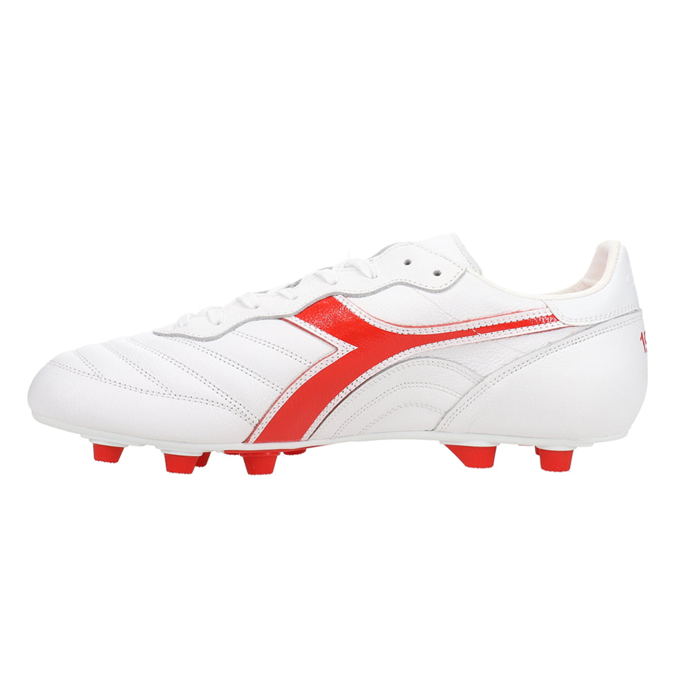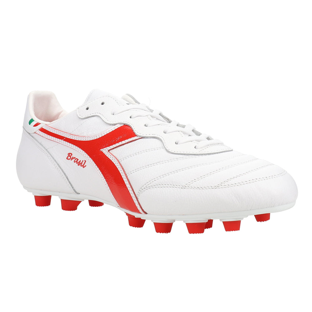 Classic touch, modern bite. The Brasil Italy OG LT+ MDPU Firm Ground Soccer Cleats in White/Red pair Italian craftsmanship with a premium leather upper and a 12-stud MDPU plate for confident traction on compact, natural grass and many synthetic surfaces. A water-resistant finish, anti-slip heel lining, and an anatomical, removable insole round out a fit that feels dialed from whistle to whistle.