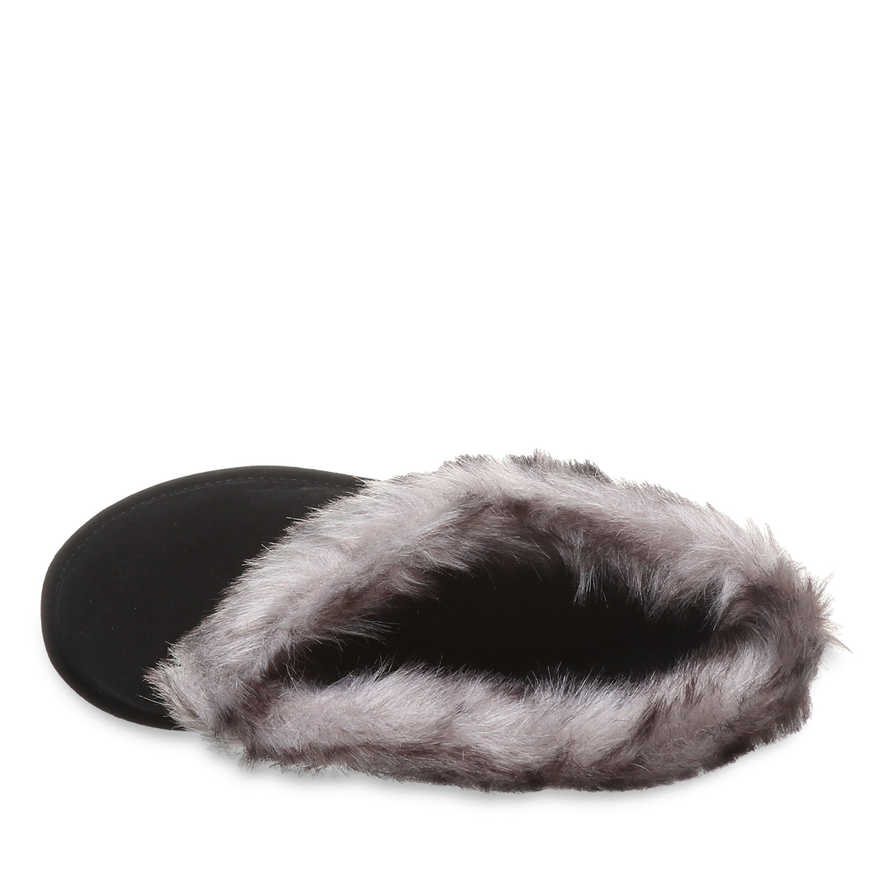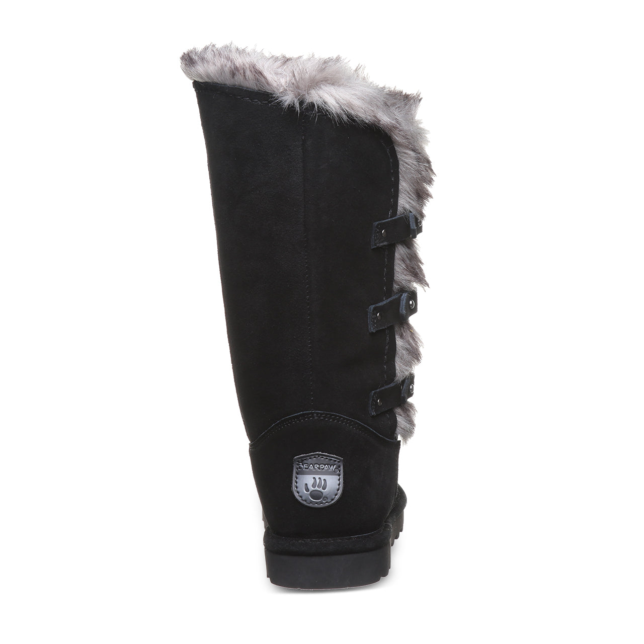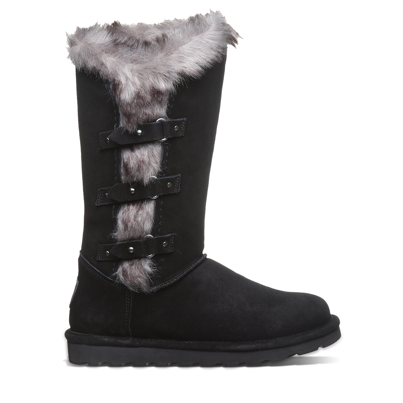 A cozy, 11-inch tall boot with decorative strap details and a soft faux fur collar adds a statement-ready touch to cool days.