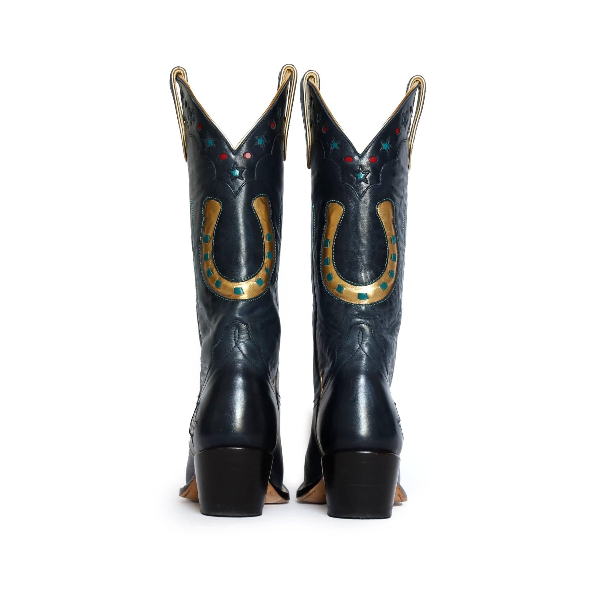 Lucky horseshoe in gold along with gold piping, rose detail on counter on rich navy leather, turquoise stitching, dots and stars lining the collar a timeless look for all the horse loving ladies -