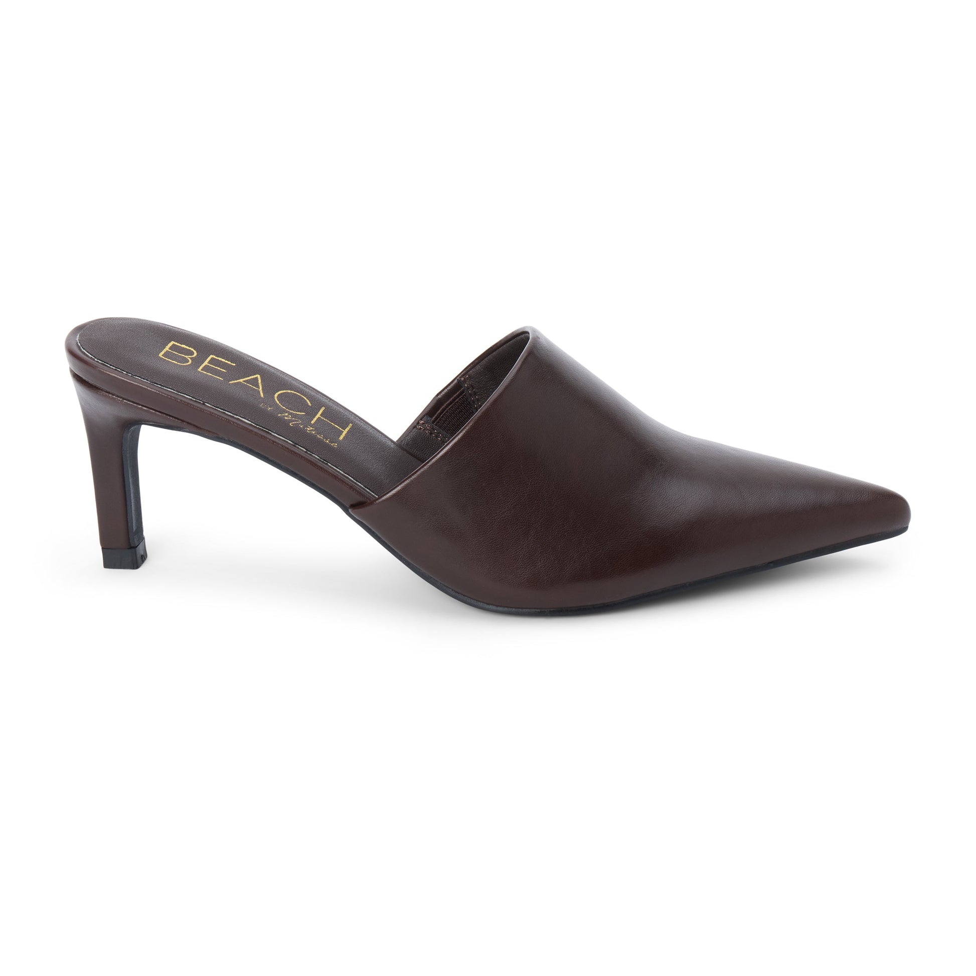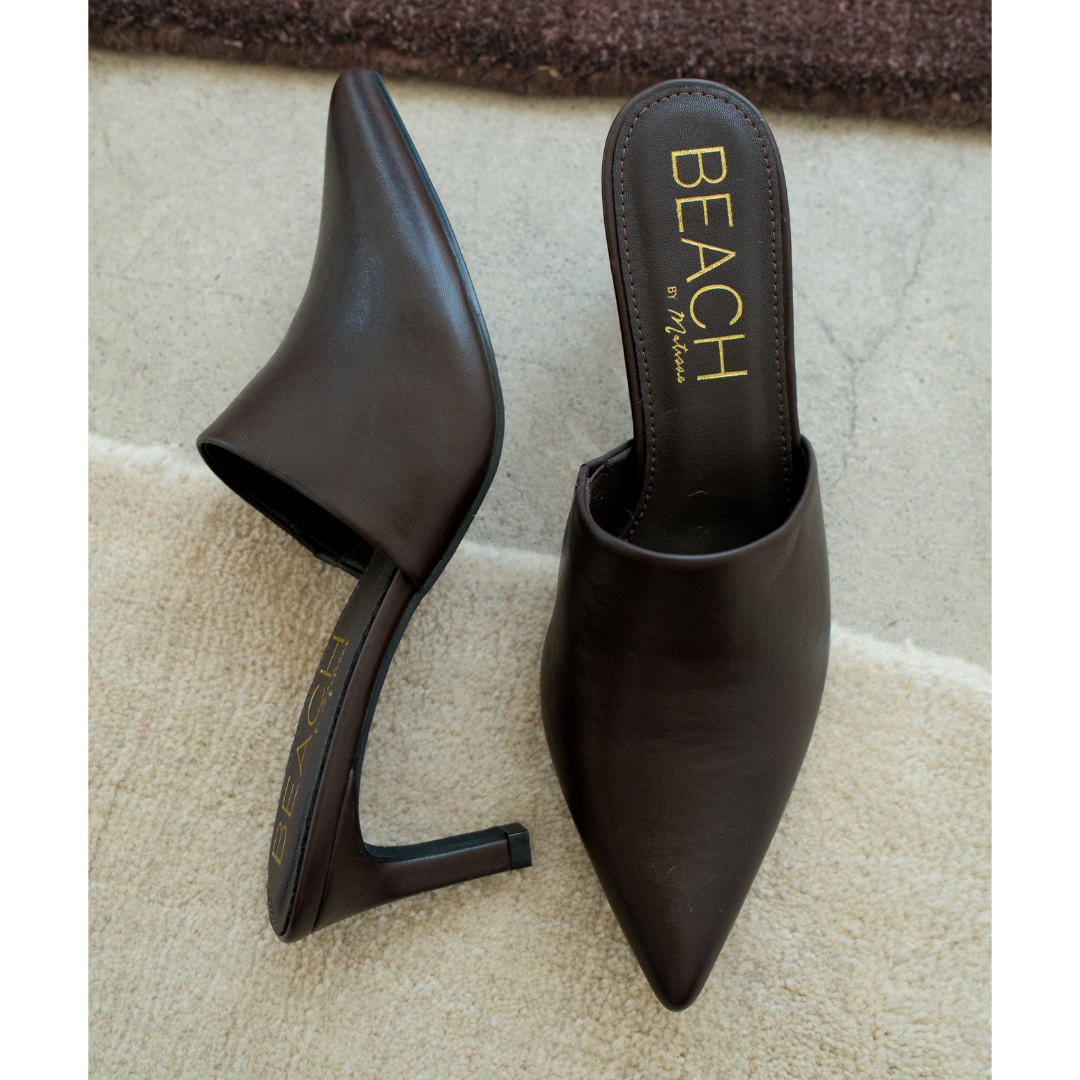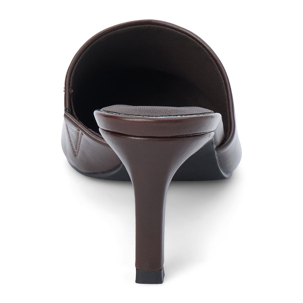 This dark brown mule features a pointed toe, a smooth finish, and a slender stiletto heel.