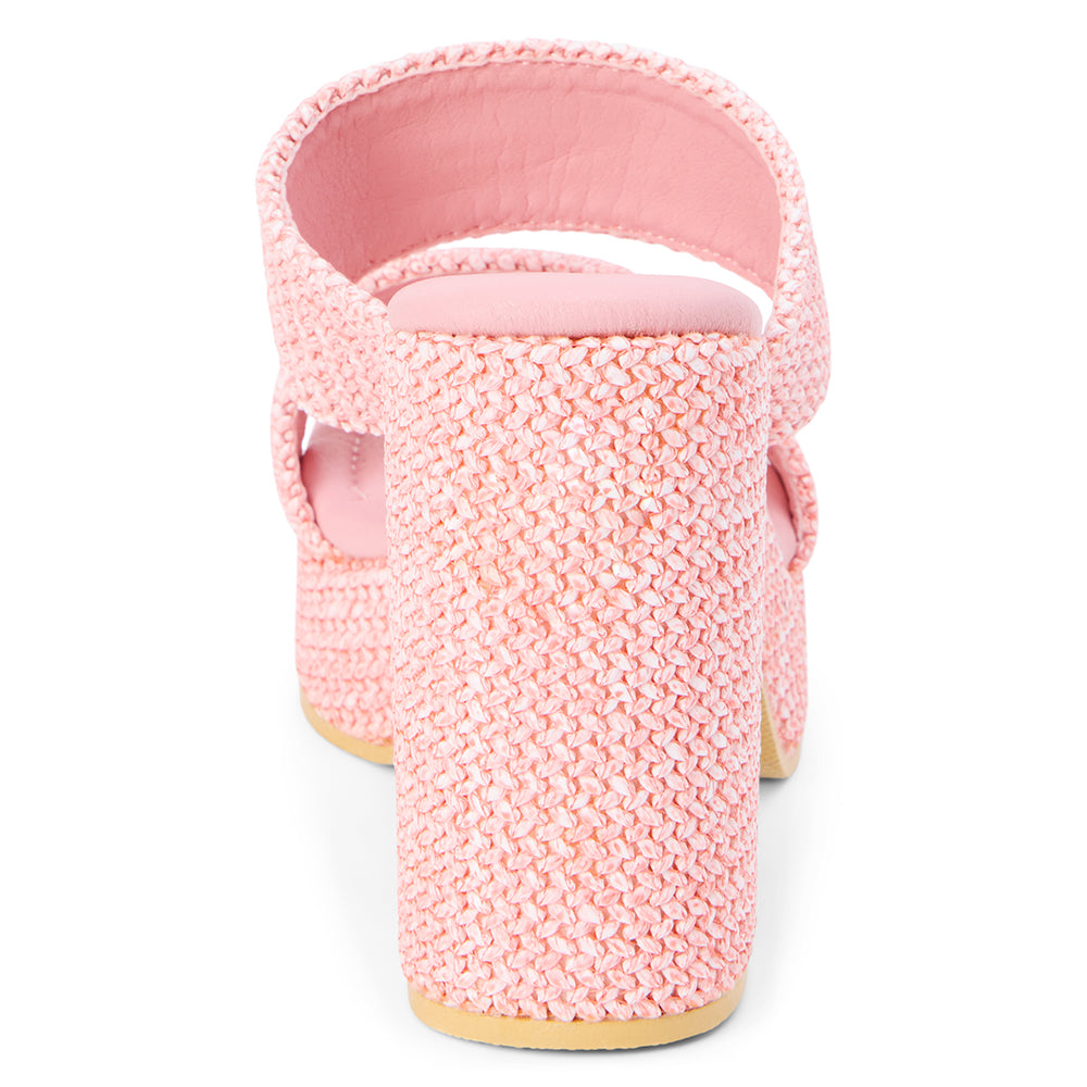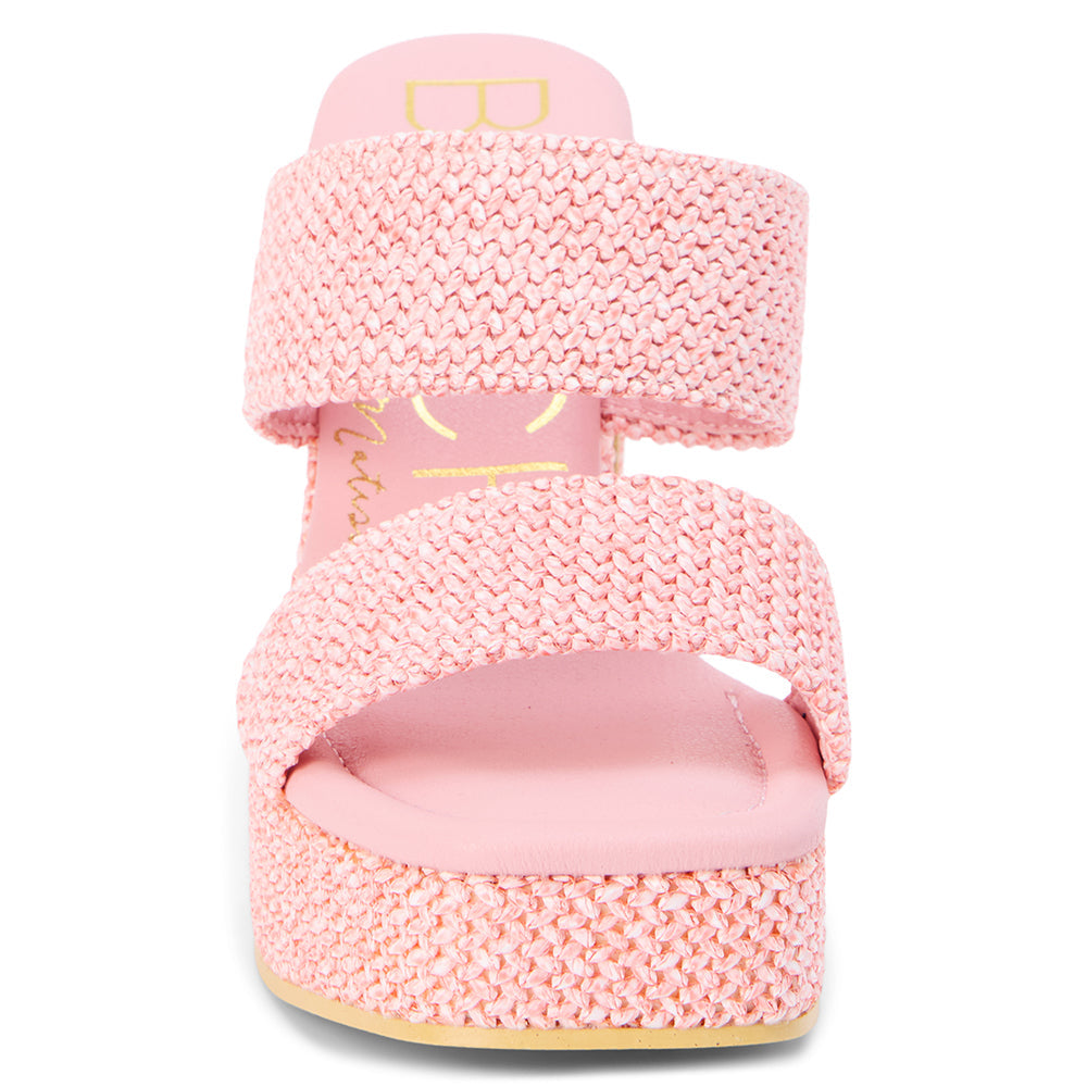 A vegan two-band platform sandal with a squared-off toe offers a modern, minimalist look.