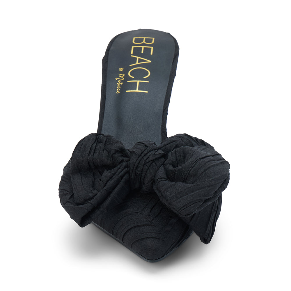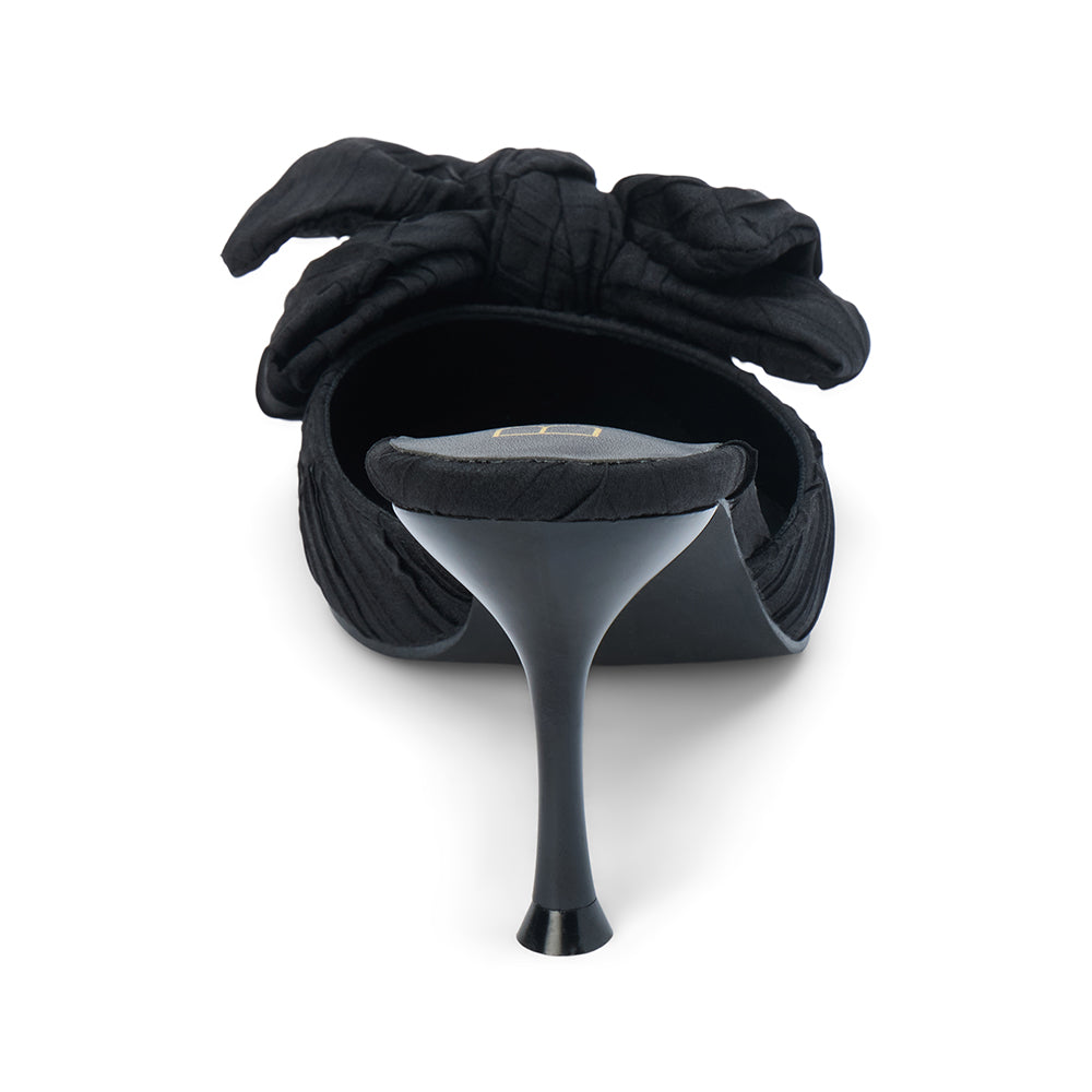 Vegan, pointed-toe mule with a sculpted heel and an oversized knotted bow for a modern, dressy silhouette.
