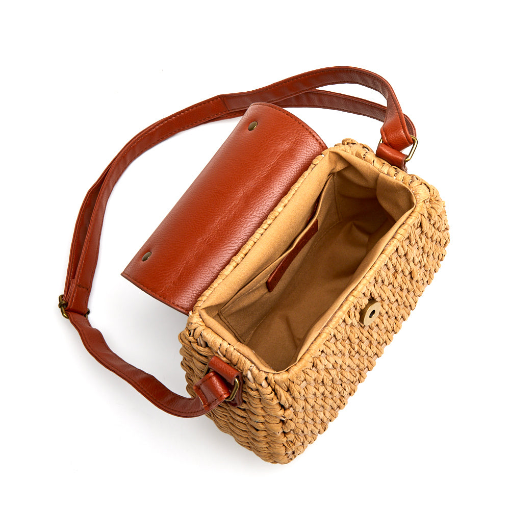Versatile top-handle crossbody bag crafted from raffia with smooth vegan leather accents.