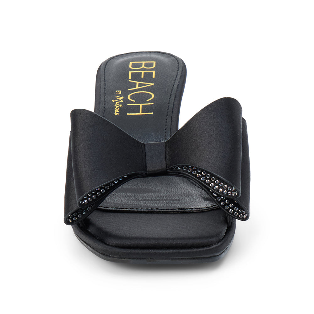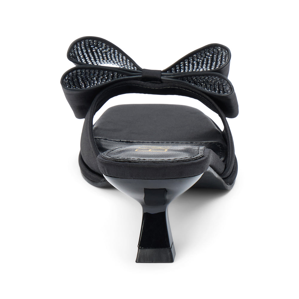 This vegan satin slip-on sandal highlights a kitten-heel silhouette and a bold oversized double bow.
