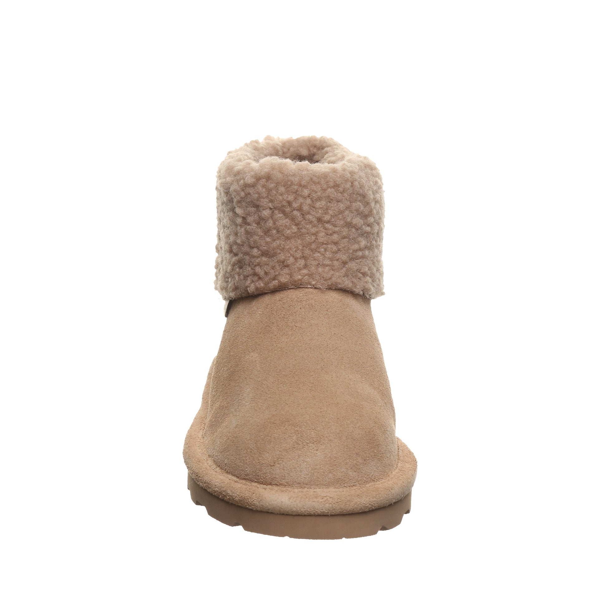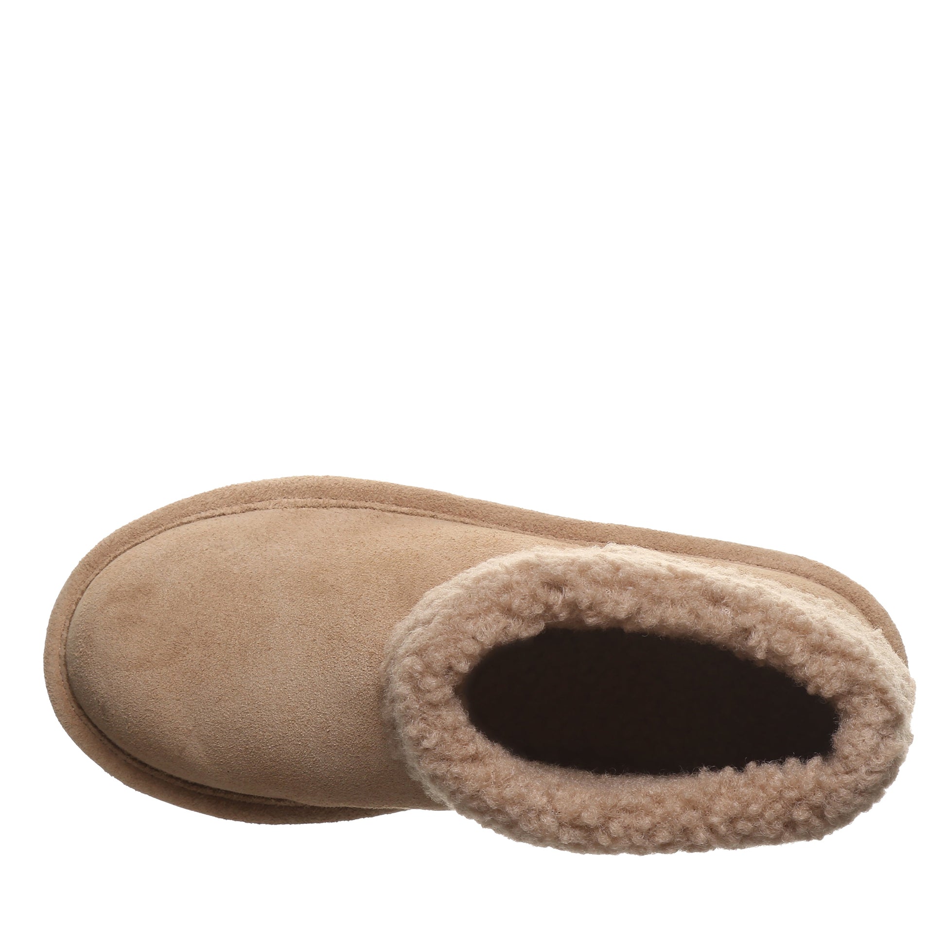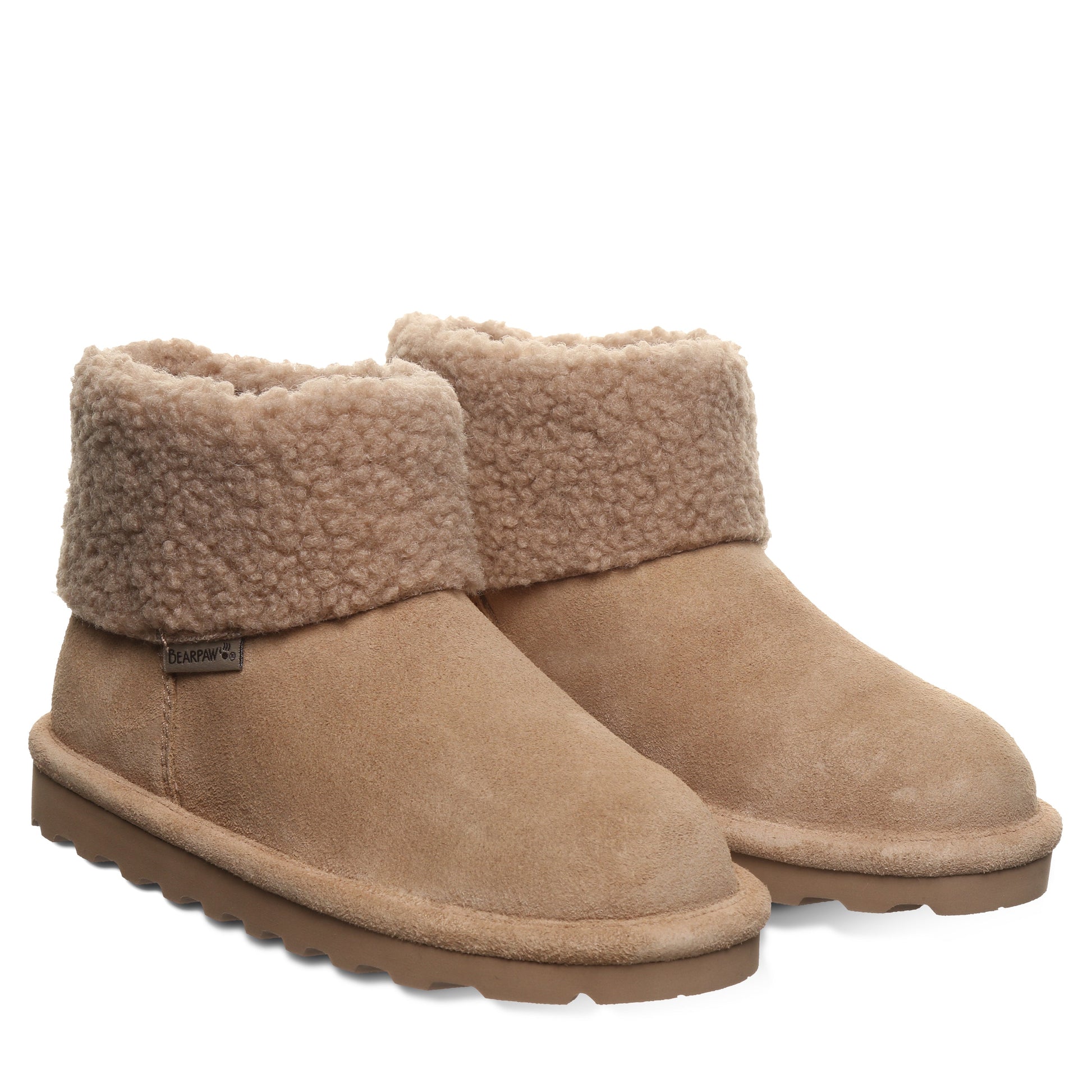 A snug boot intended for extended wear, with a soft lining and a fuzzy finish.