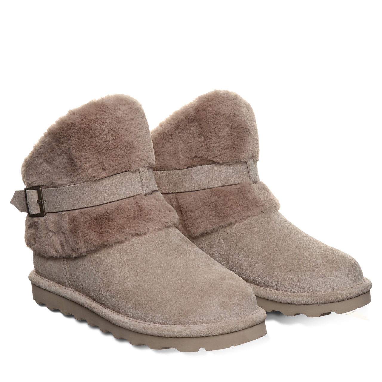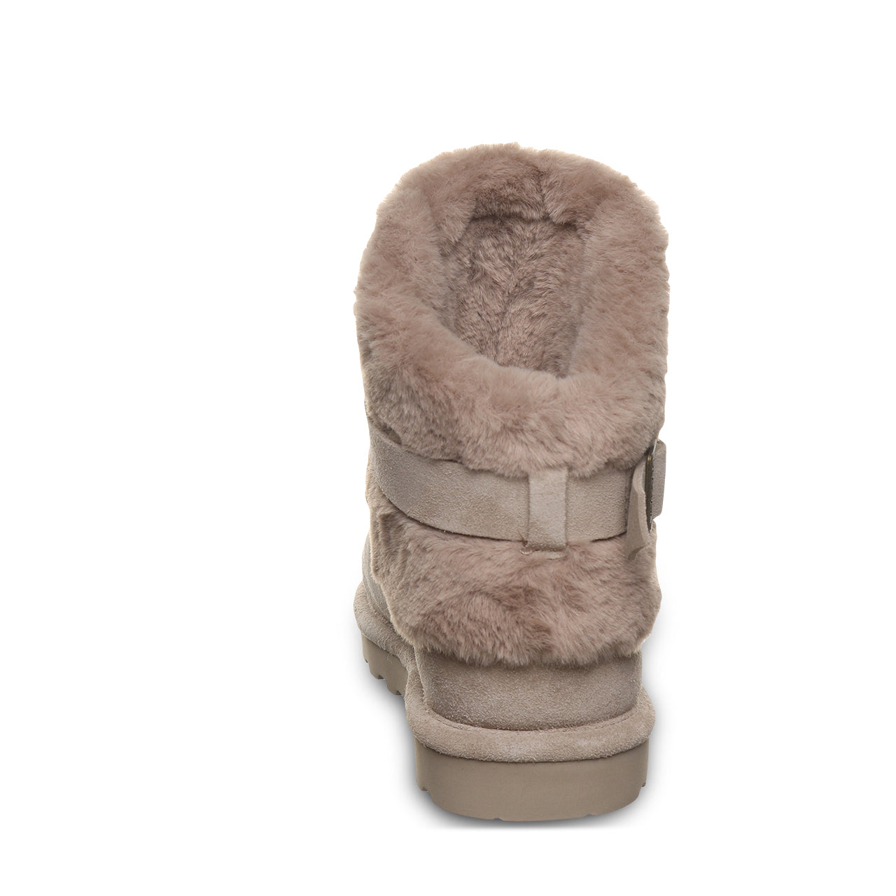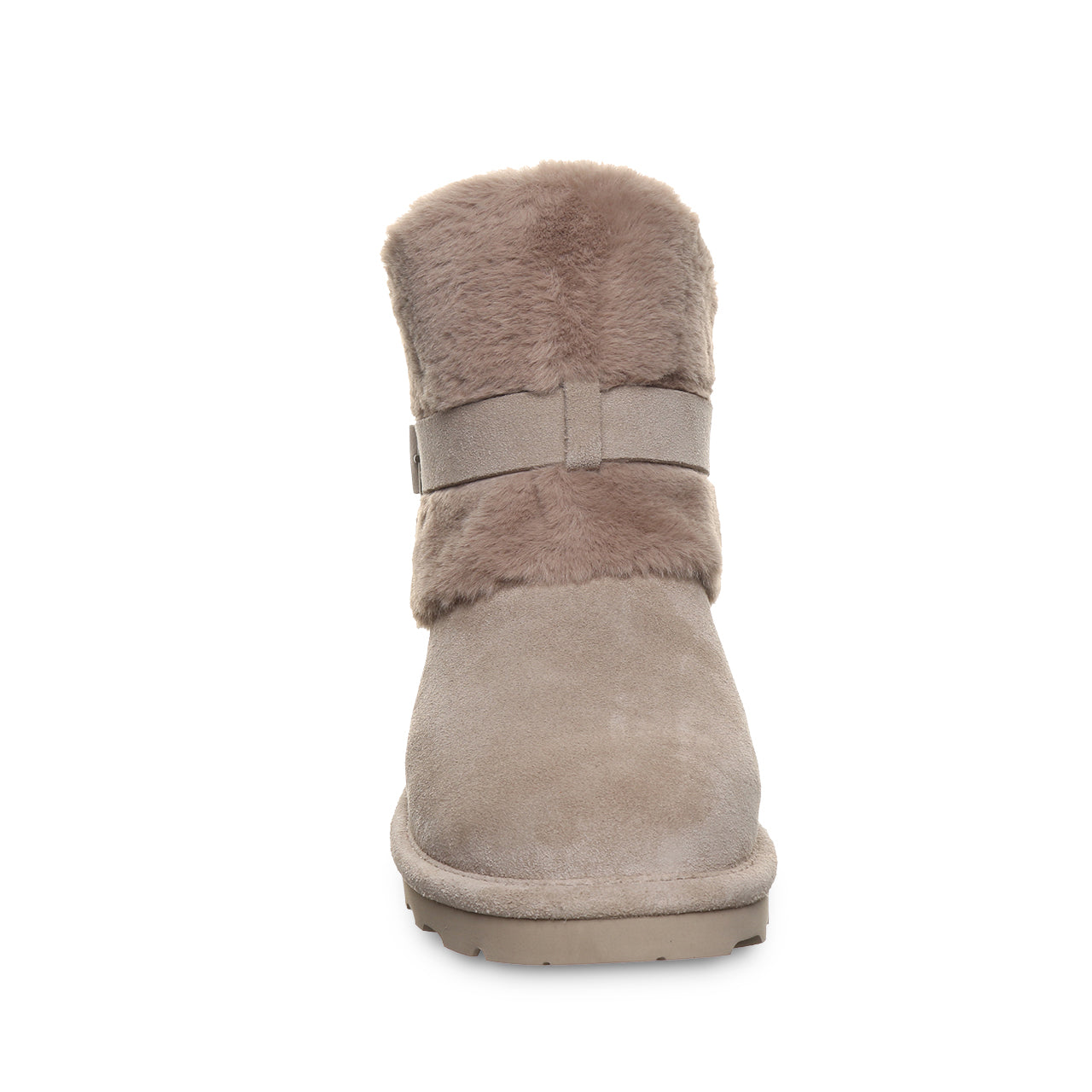 Elevate your cold-weather wardrobe with the Karmina Mushroom boot, crafted in rich suede and trimmed with a plush faux fur collar. A polished buckle detail adds a subtle fashion note while the cushioned sole supports everyday comfort.