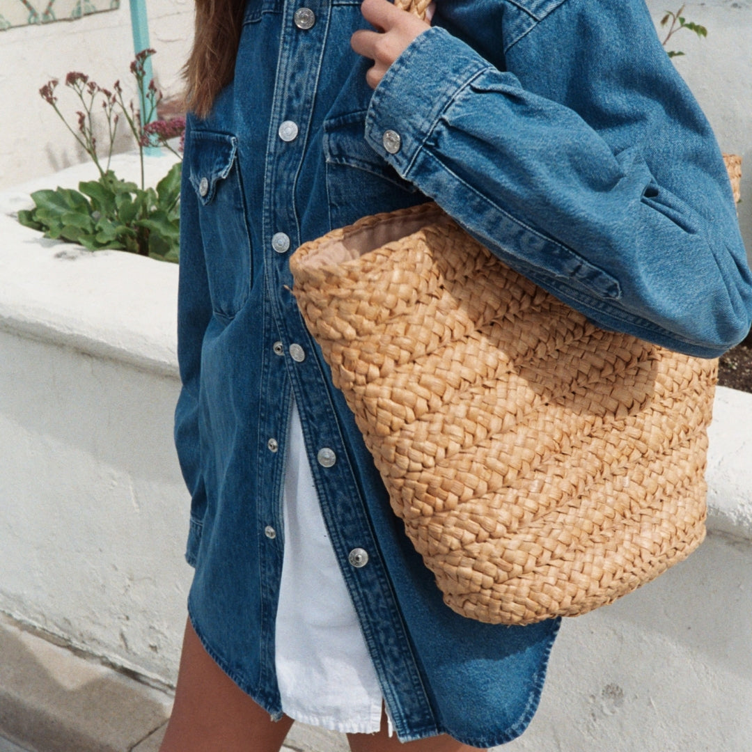 Lagoon Tote Bag features a large vegan tote crafted from woven raffia with a textile lining.