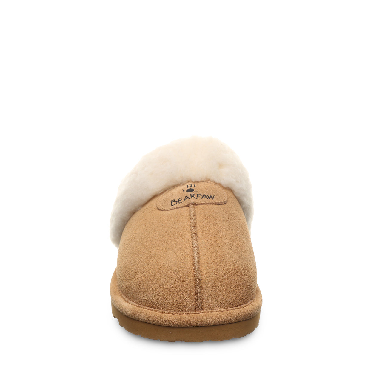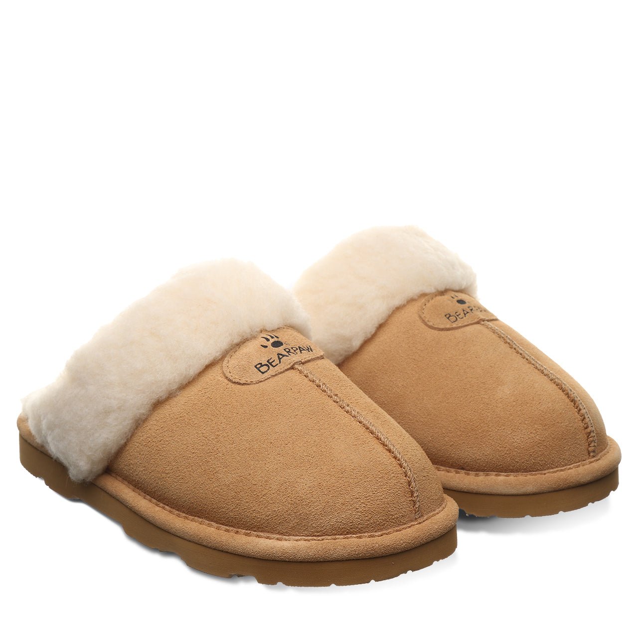 Cozy slippers with soft suede uppers and a wool-blend collar provide warmth and everyday comfort for indoor wear.