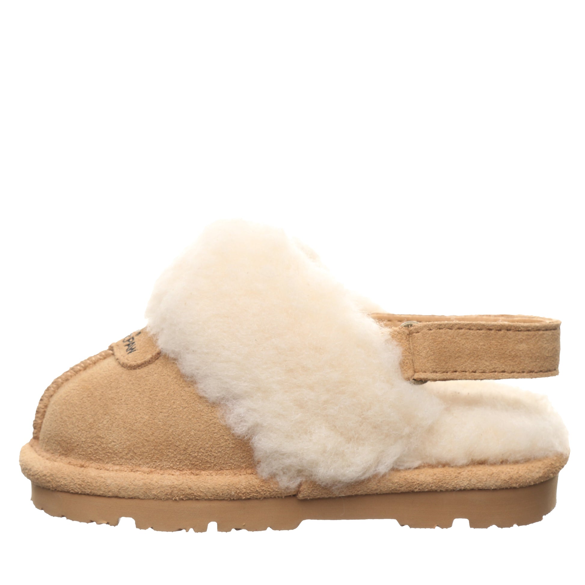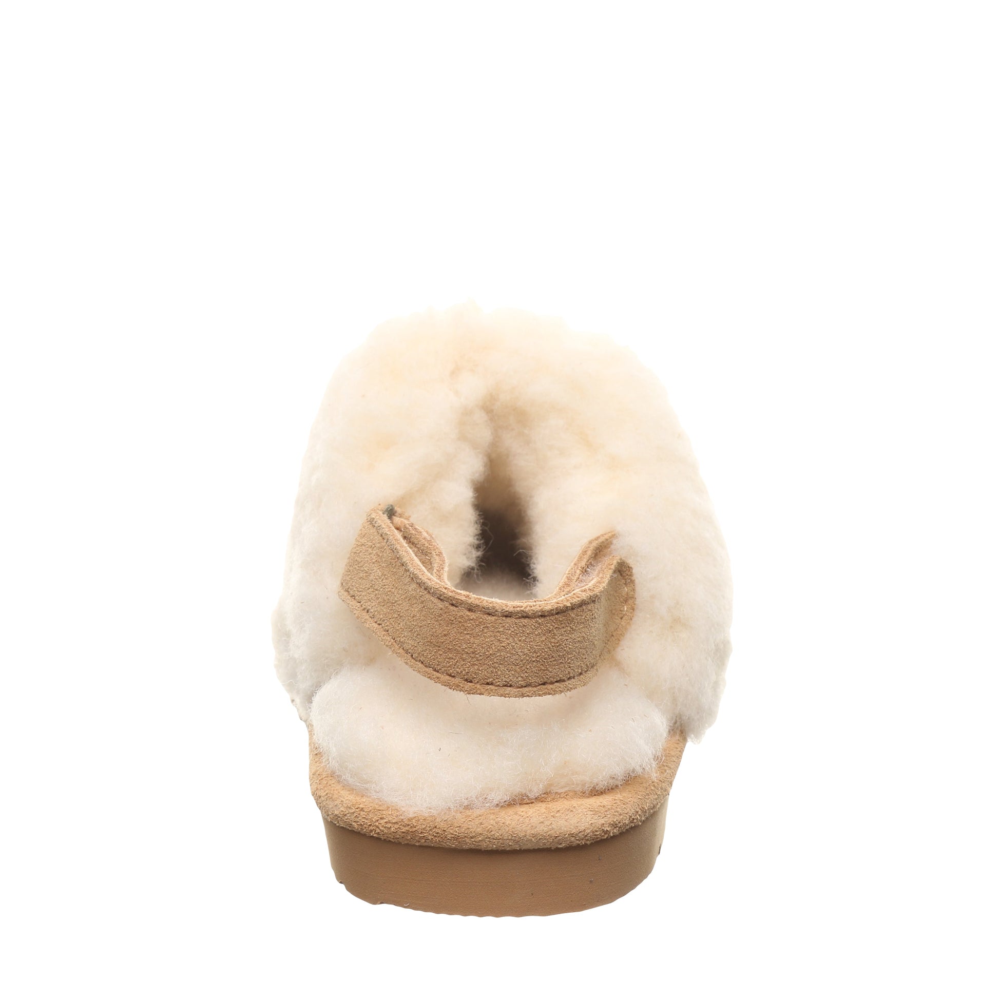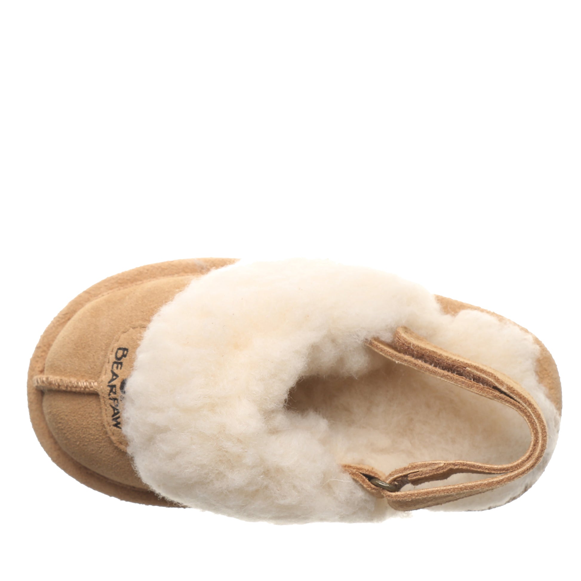 This toddler slipper provides warmth and steady comfort for tiny feet, featuring a suede upper and plush interior, along with an easy slip-on design for quick wear.
