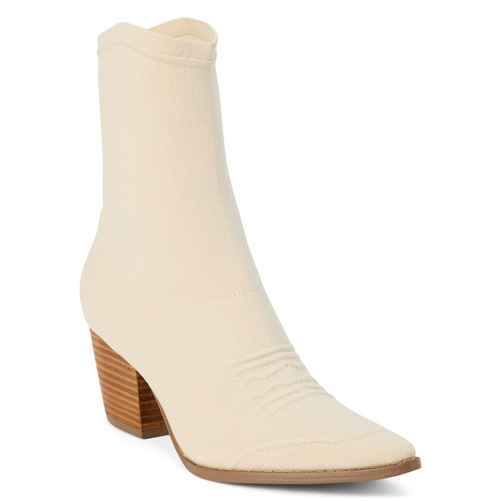 A Western-inspired ankle boot featuring a stretch-knit upper for flexible wear.