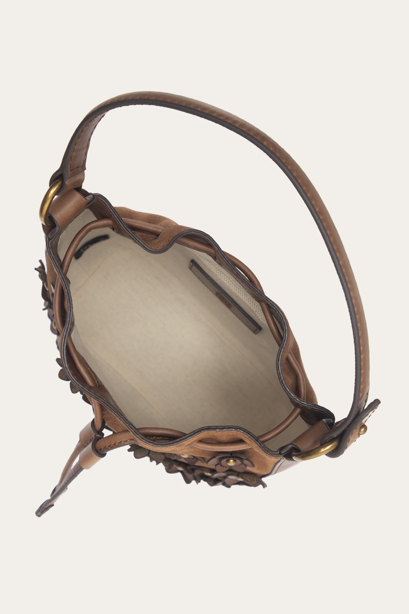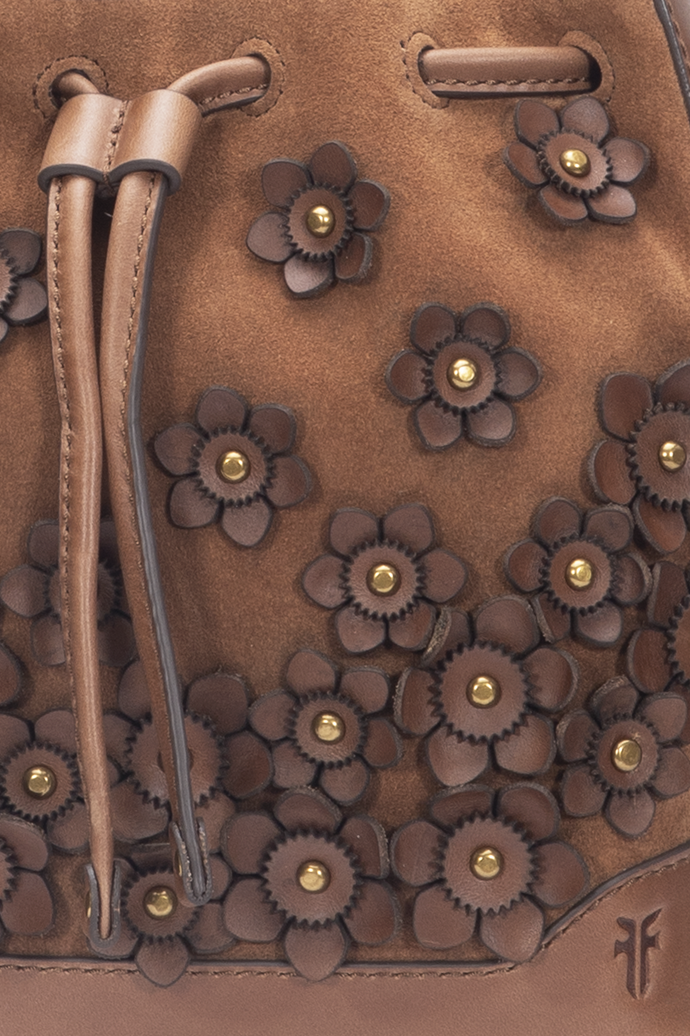 Designed as an everyday bag, this bucket-style carryall features a secure drawstring closure and a floral pattern on durable leather.