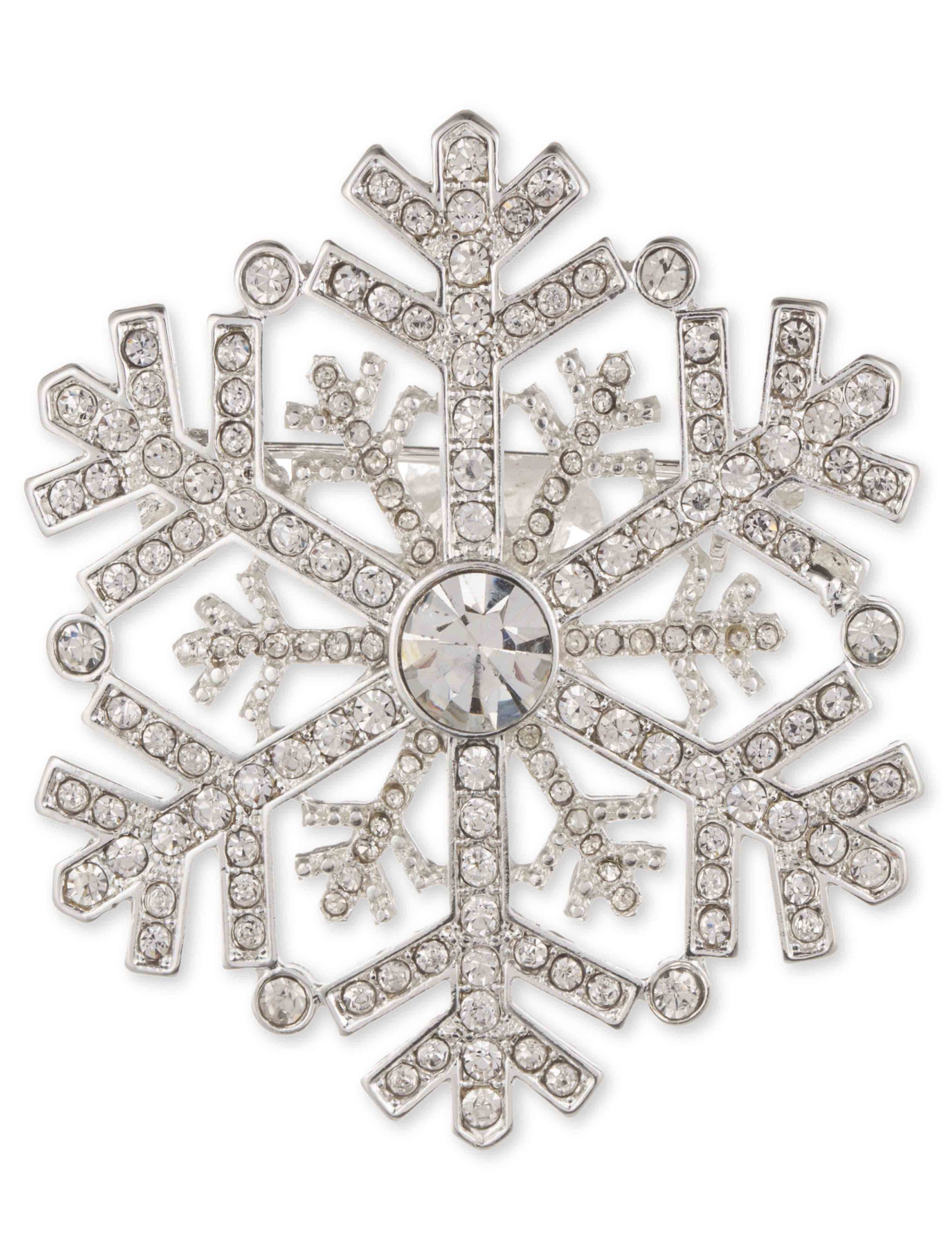 Elevate your look with a snowflake-inspired pin finished in silver and set with clear pavé crystals.