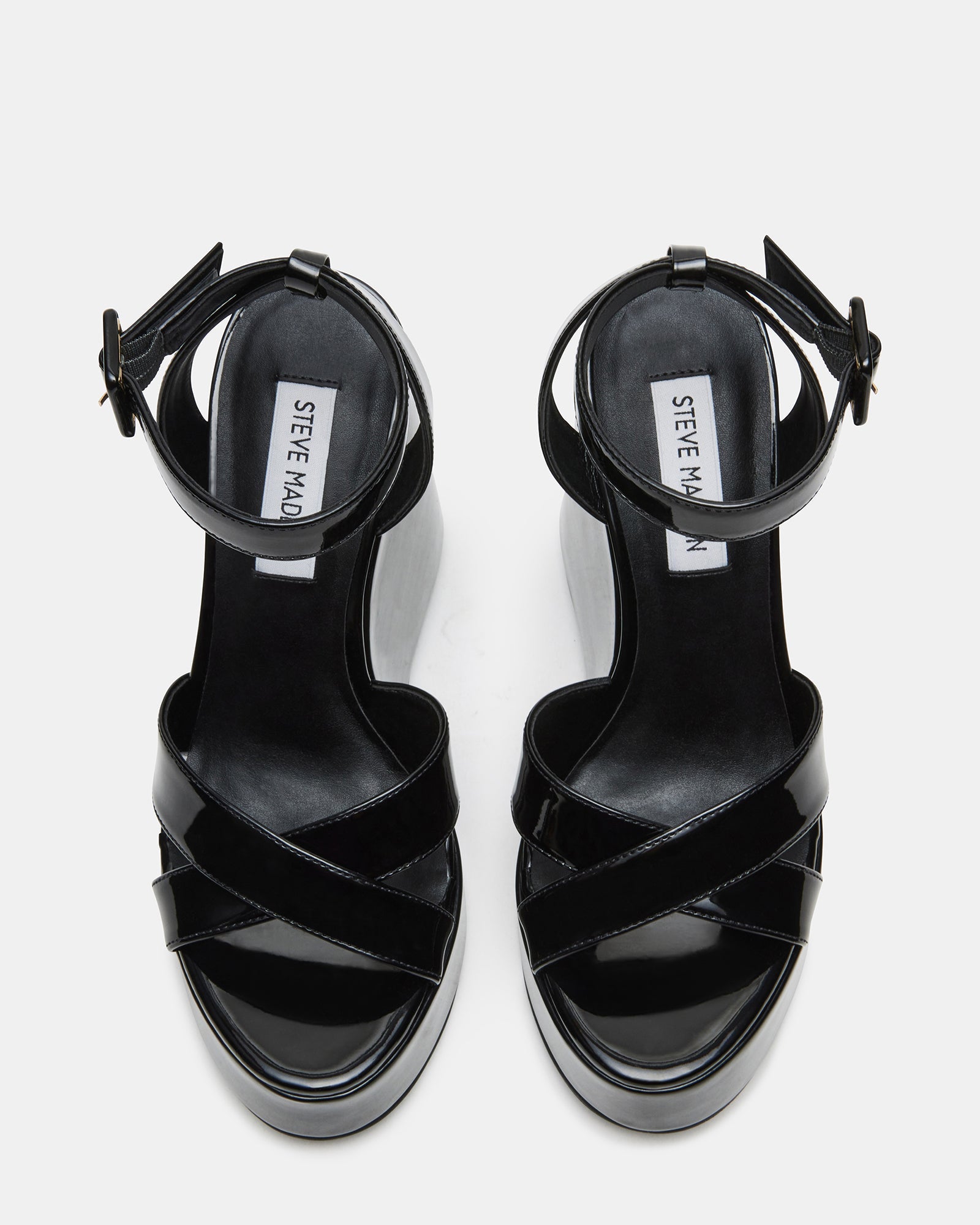 The PINNACLE Black Patent platform wedge sandal blends style with height for versatile wear.
