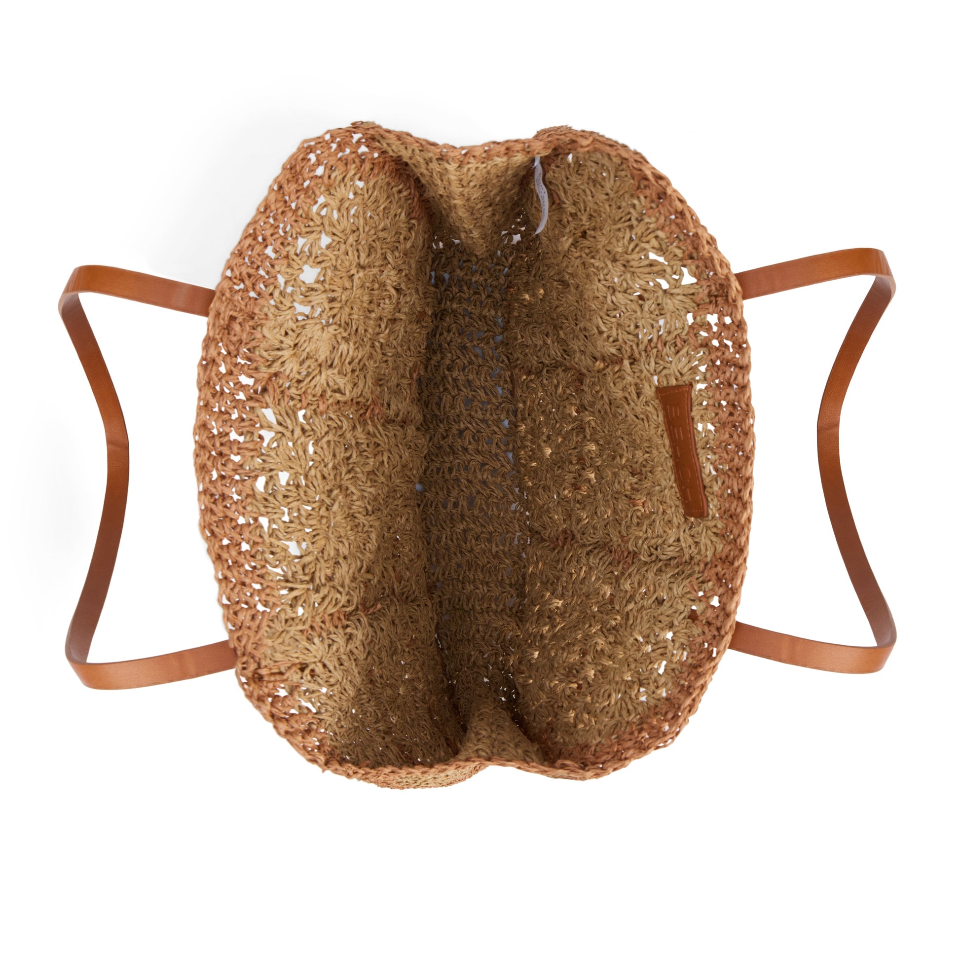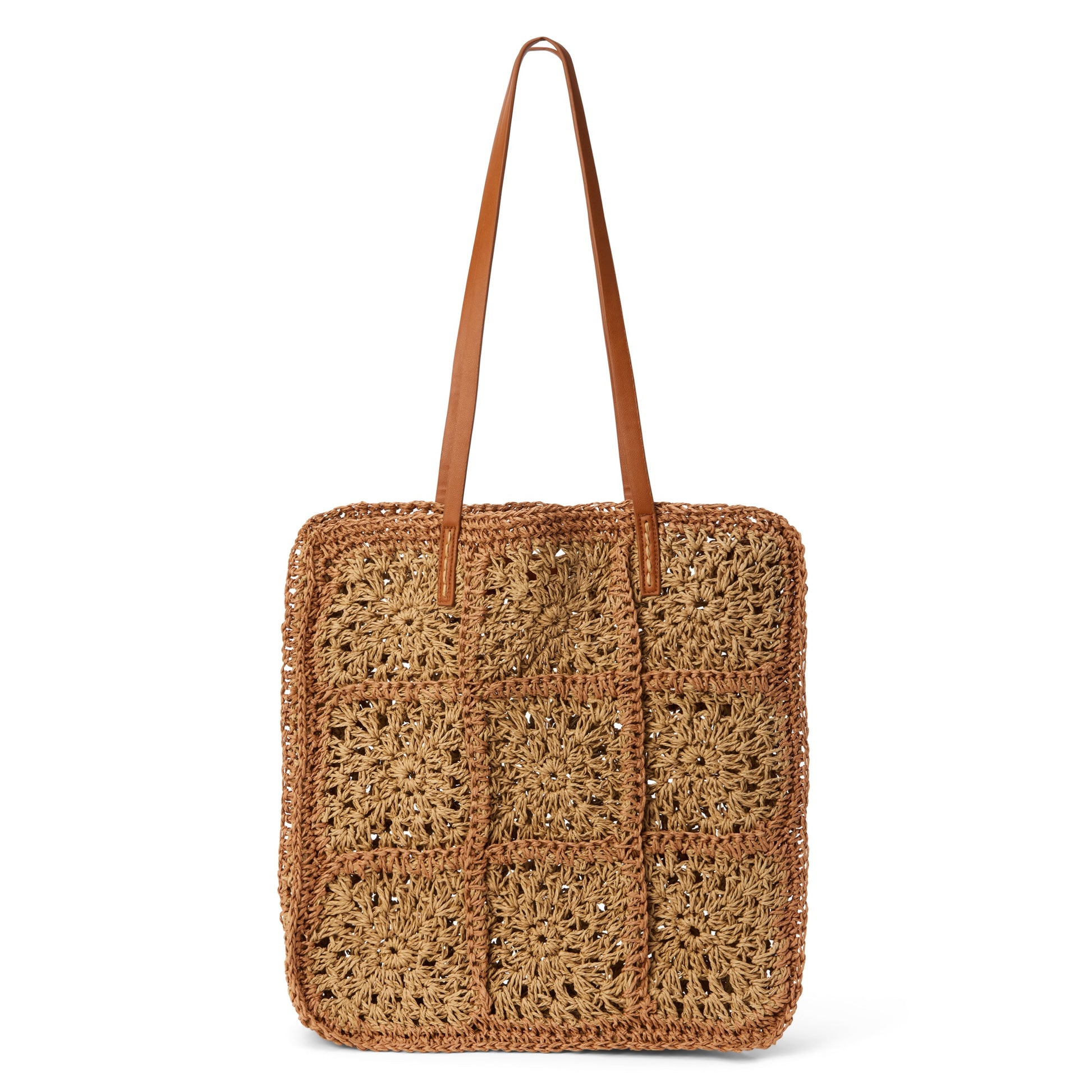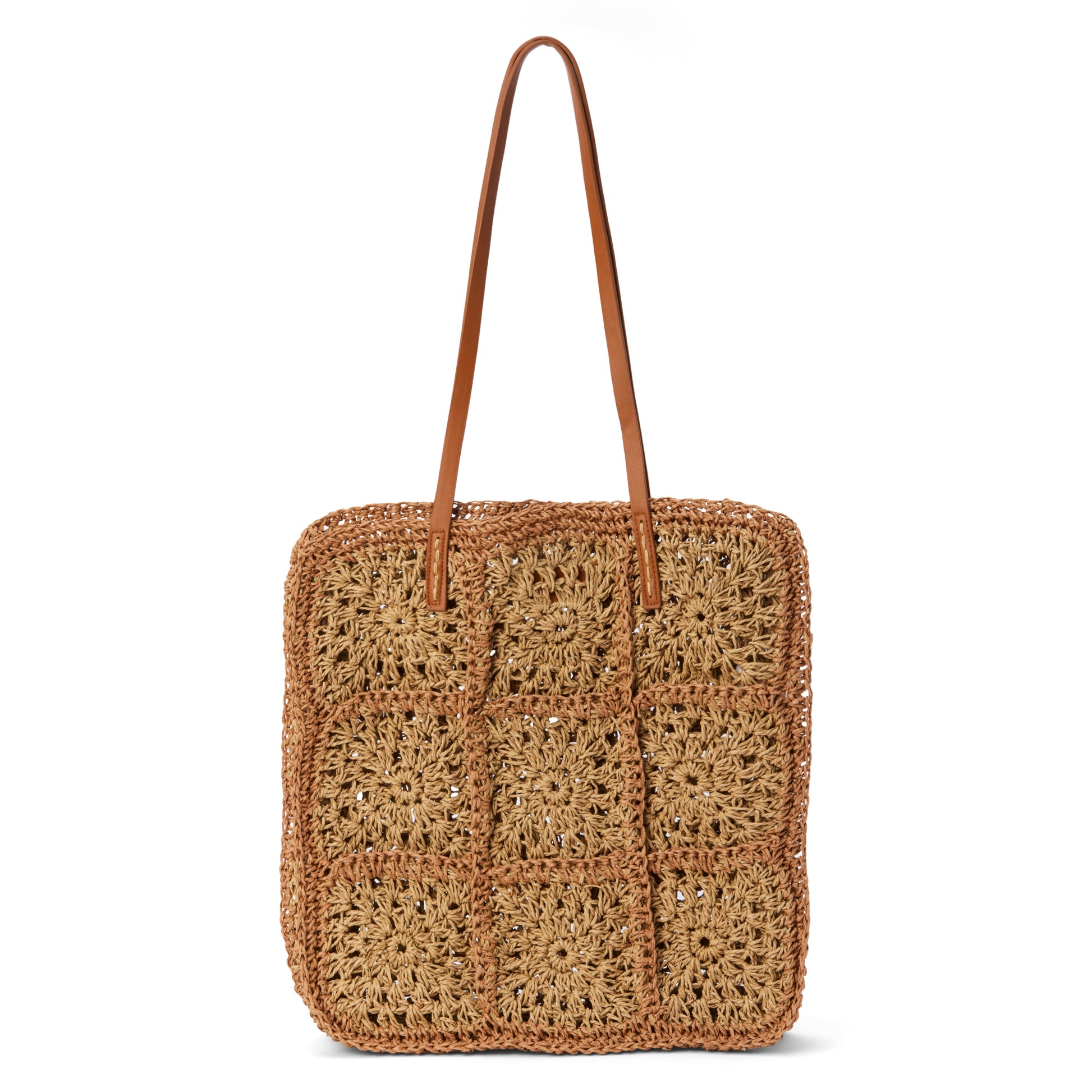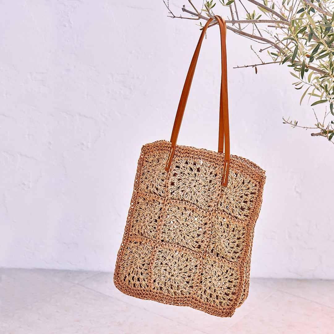 Vegan macramé tote bag with leather straps and a square grid pattern, designed for casual days and beach trips.