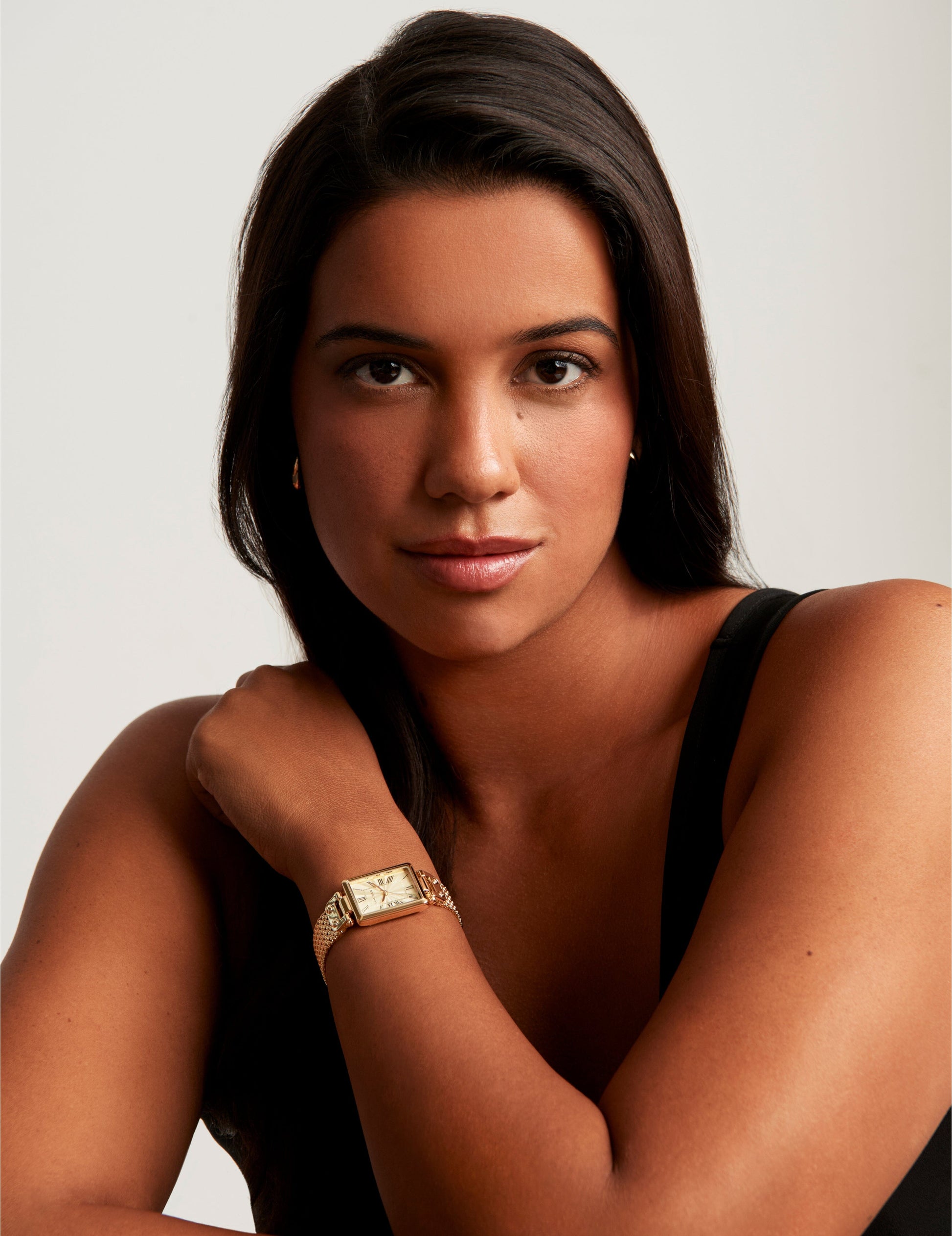 A refined timepiece featuring a rectangular case and a sleek mesh bracelet.