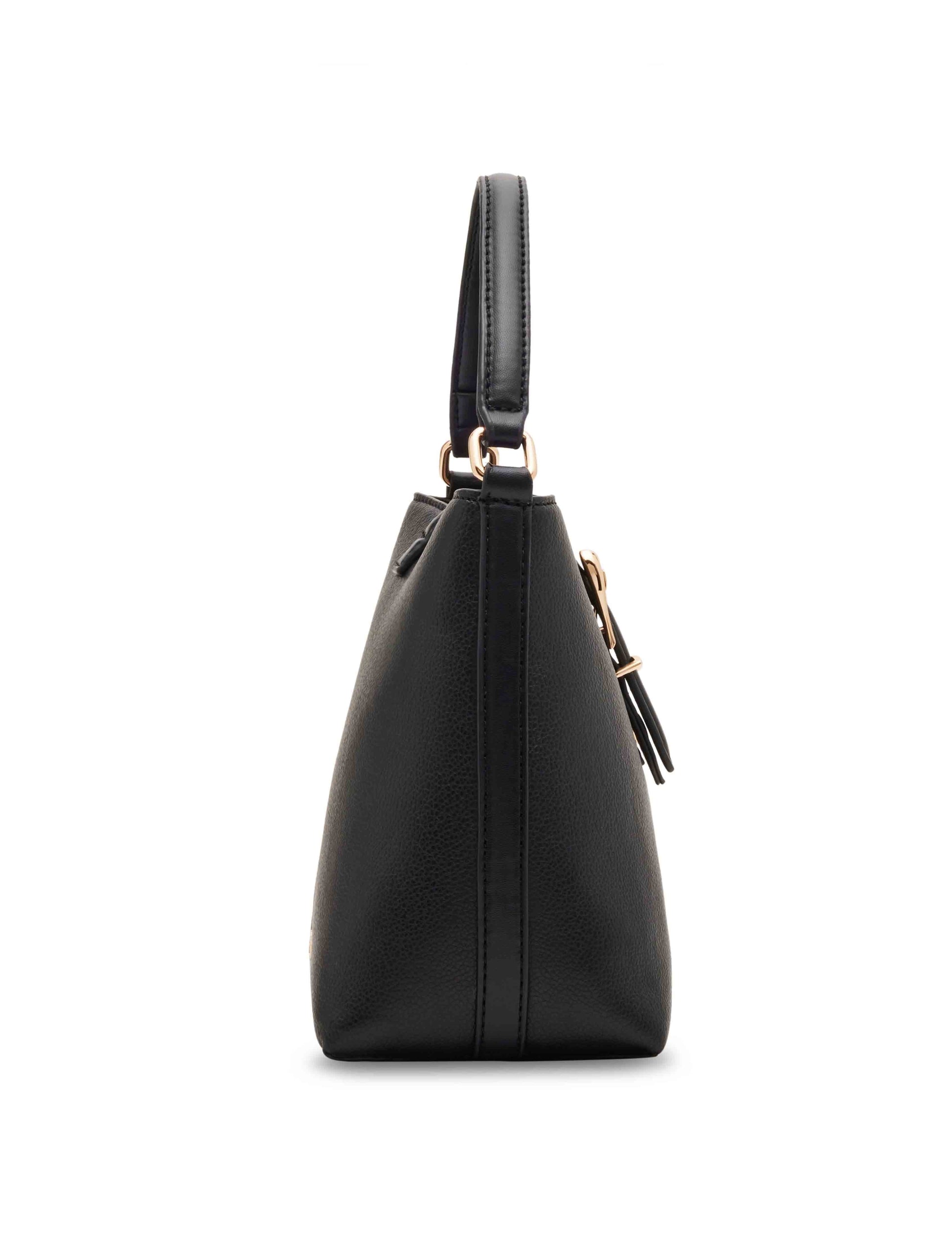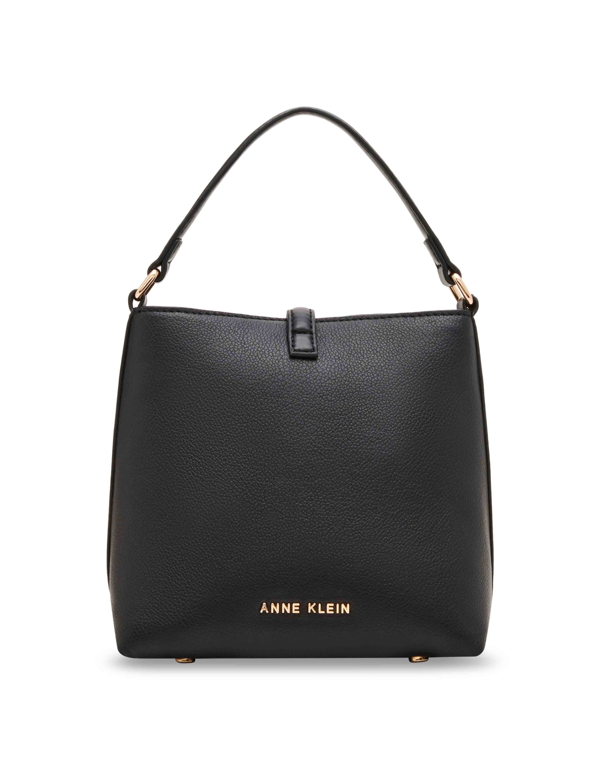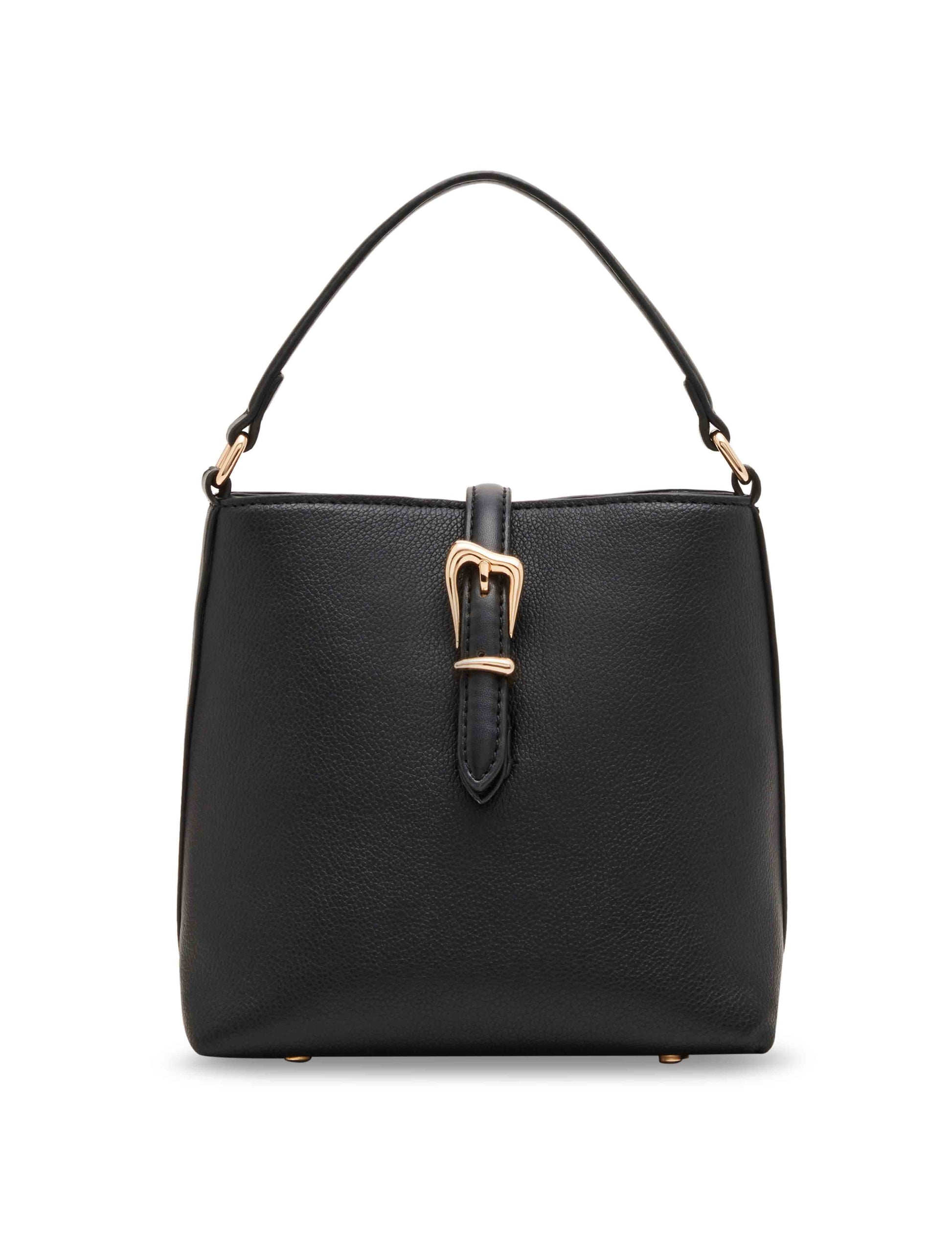 - Sculpted buckle detail on the front doubles as a magnetic snap closure.