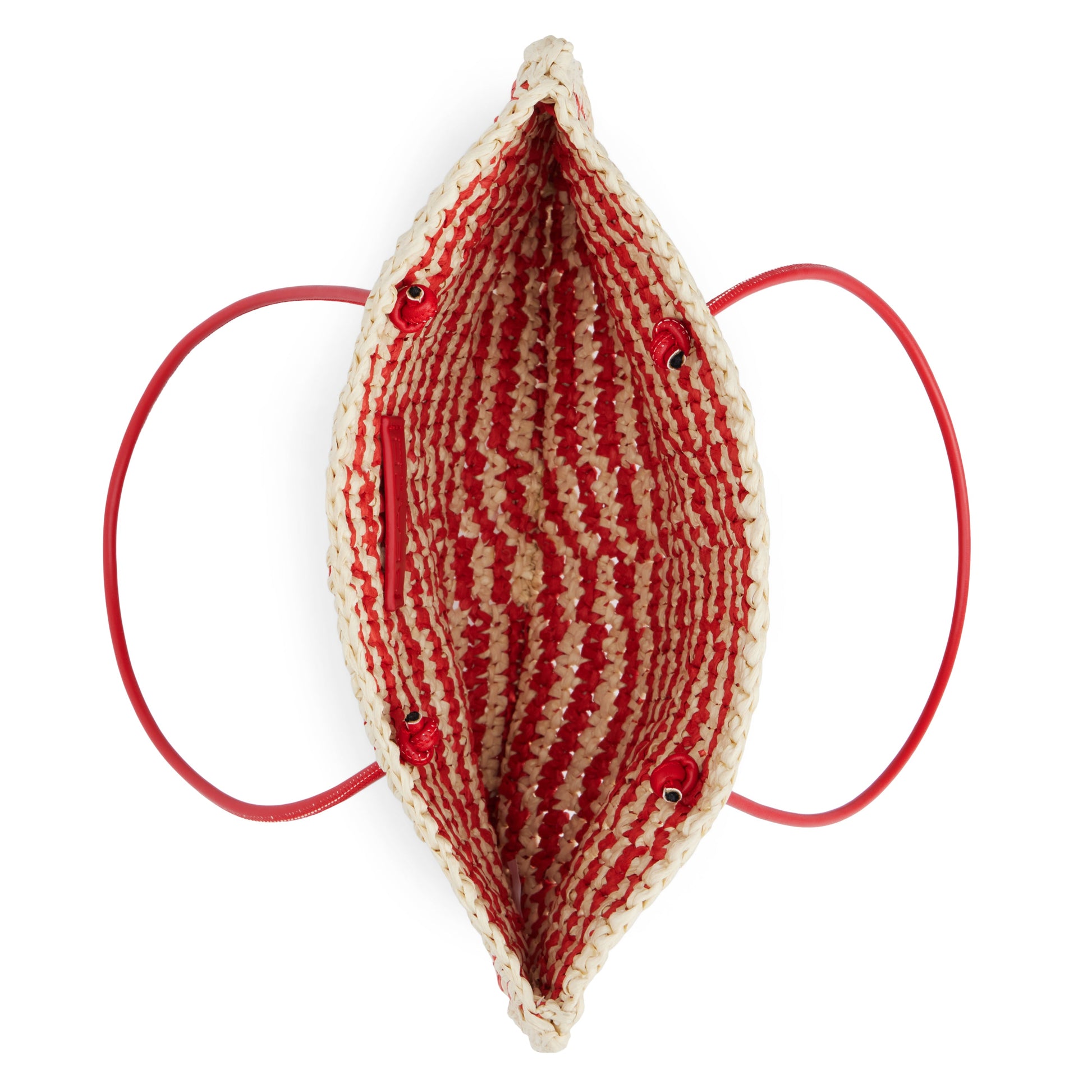 Compact tote crafted from woven raffia with soft vegan leather straps.