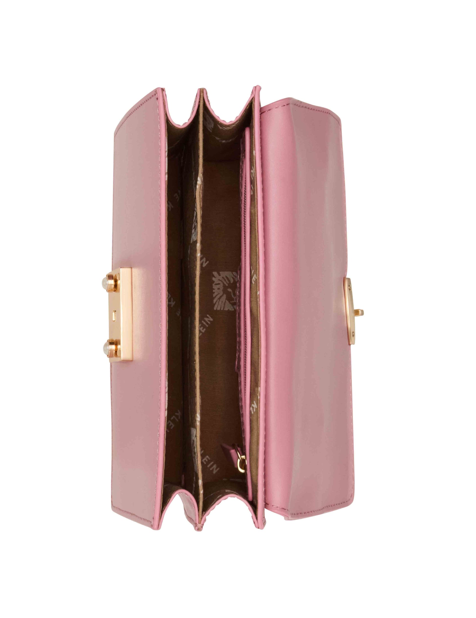 This compact top-handle bag blends style with practical space and includes a pearl pushlock and a built-in mirror accessory.