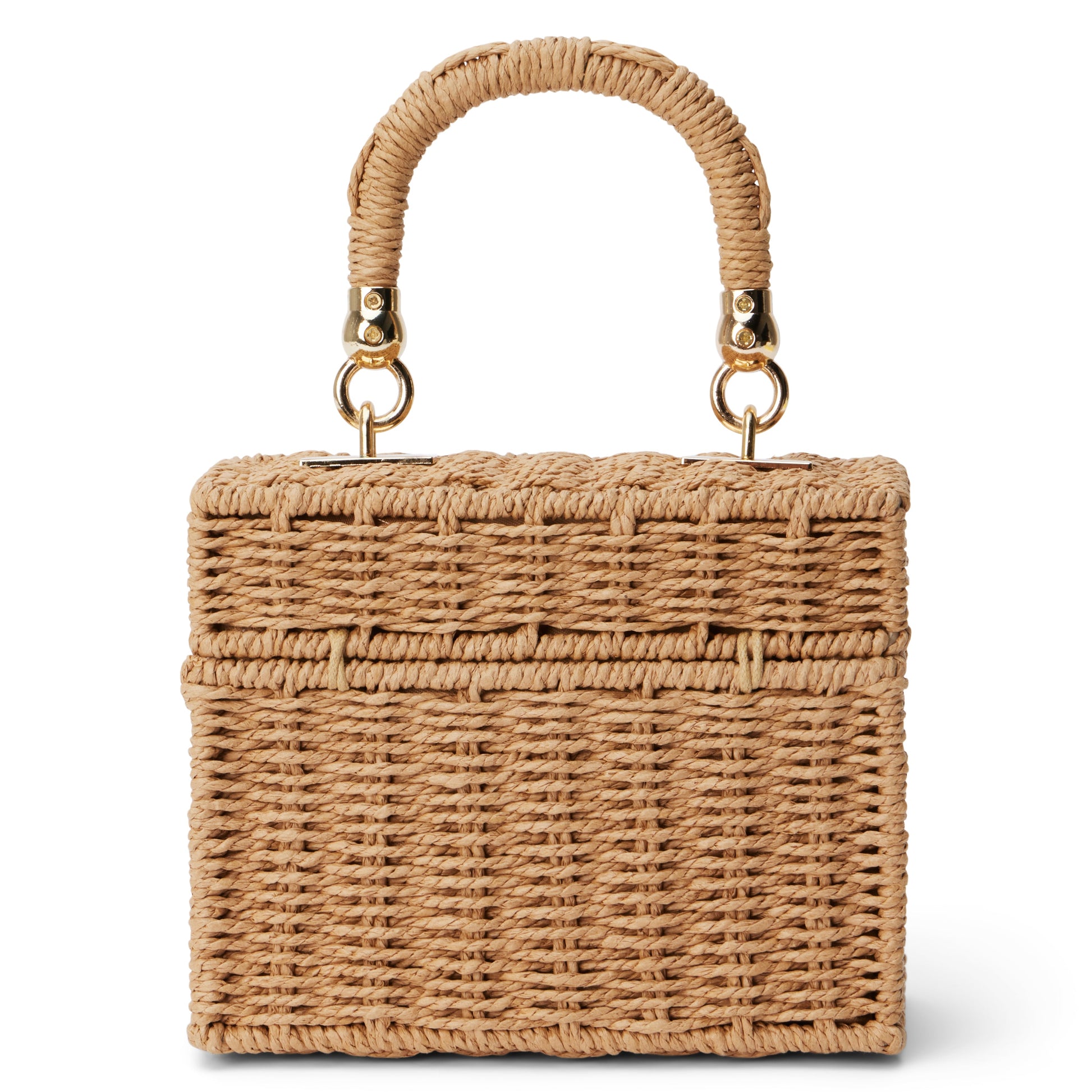 A vegan raffia handbag with a top-handle and chain strap, designed in a small, picnic-style silhouette.