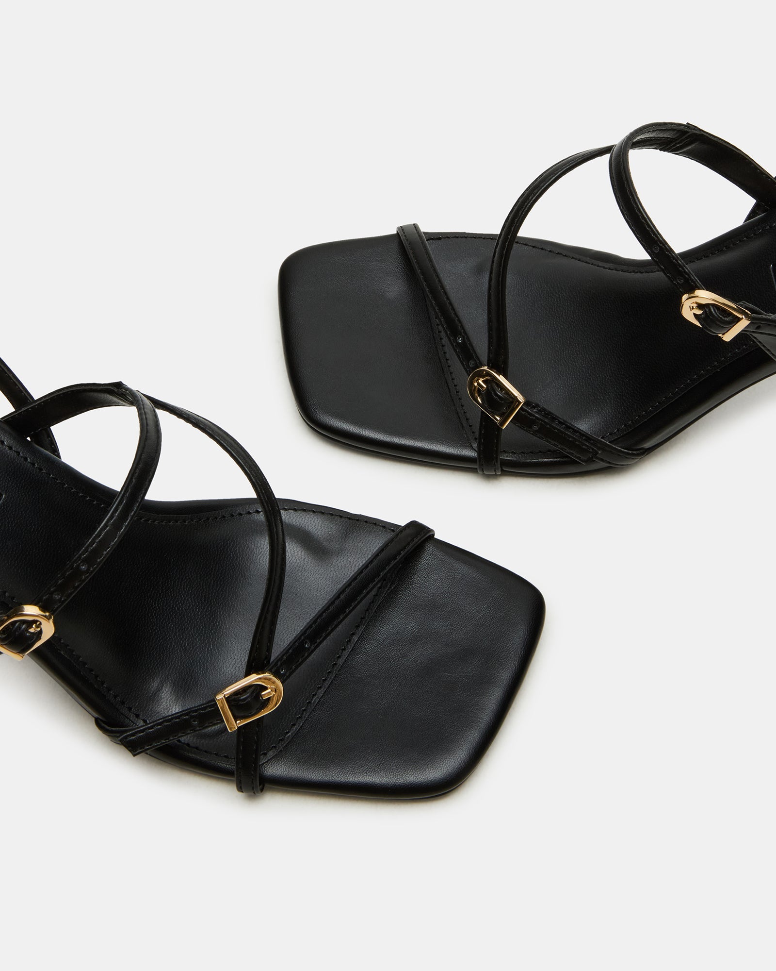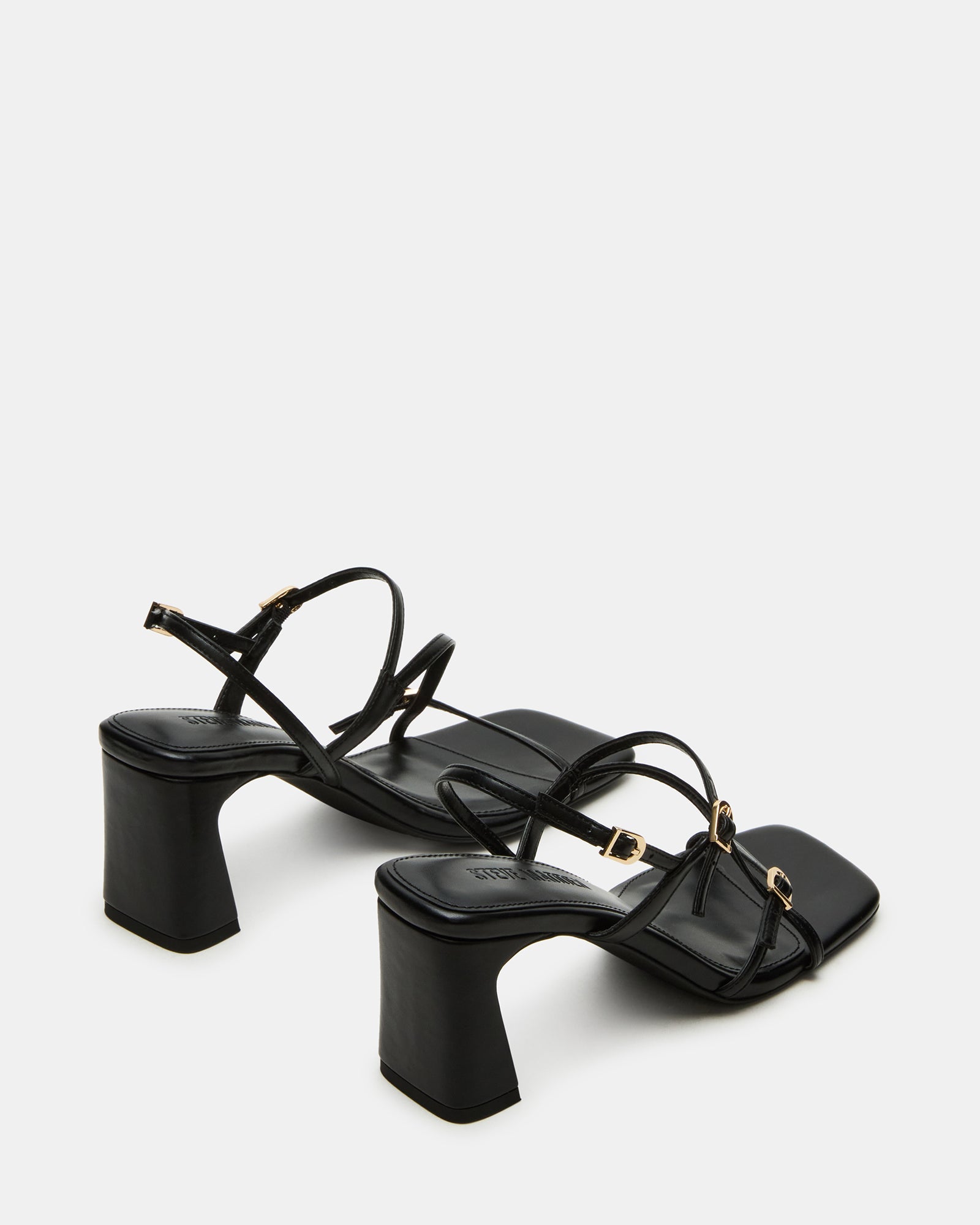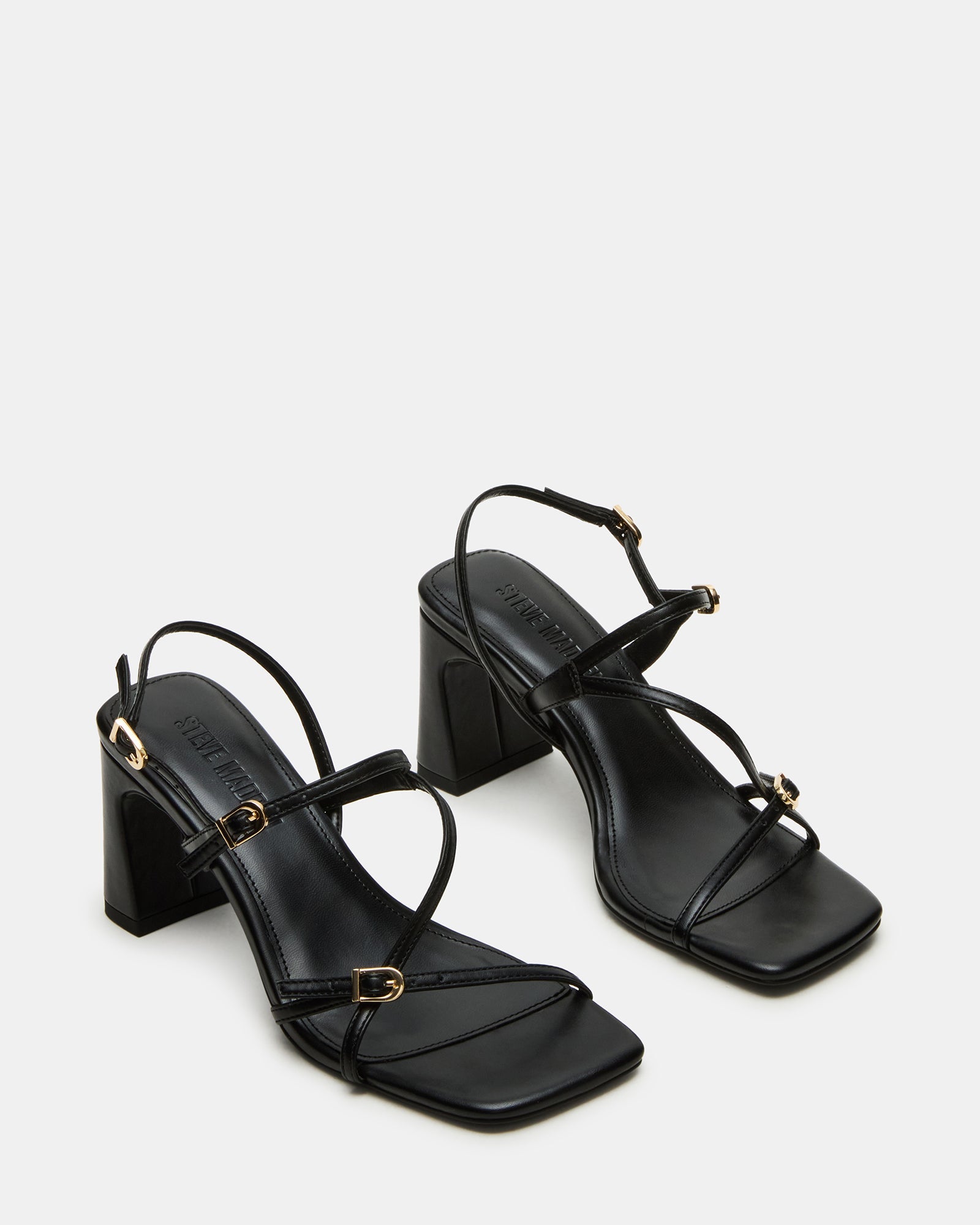 Polished, modern styling with a square-toe heel and secure buckled straps.